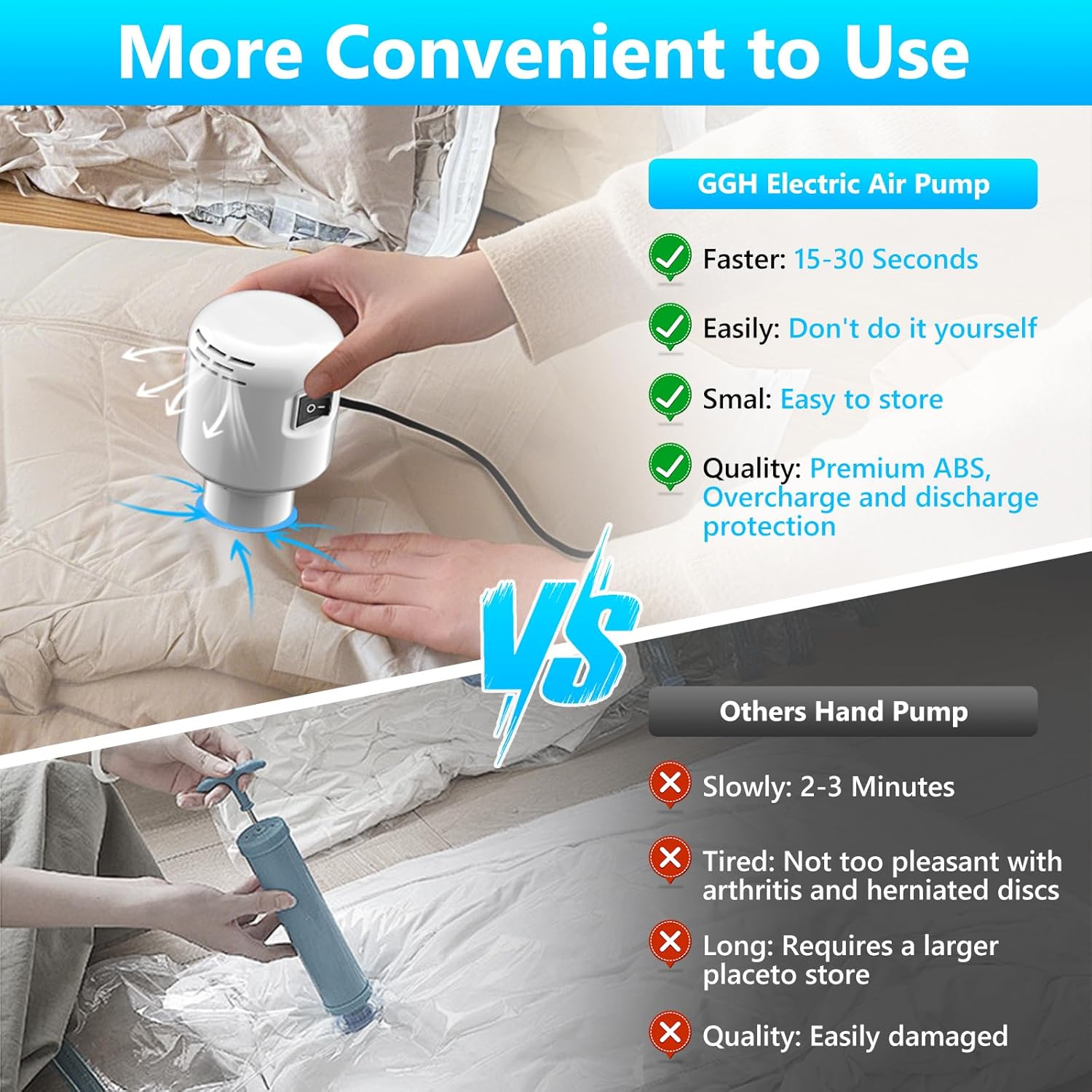 【Electric Air Pump Replaces Hand Pump - GGH Efficient Choice】GGH electric vacuum pump for vacuum storage bags outperforms hand pumps in convenience and speed when extracting air from space saver bags. Simply plug it into the socket and flip the switch—this hassle-free operation turns compressing and storing items into an effortless task, saving you valuable time and energy.​
