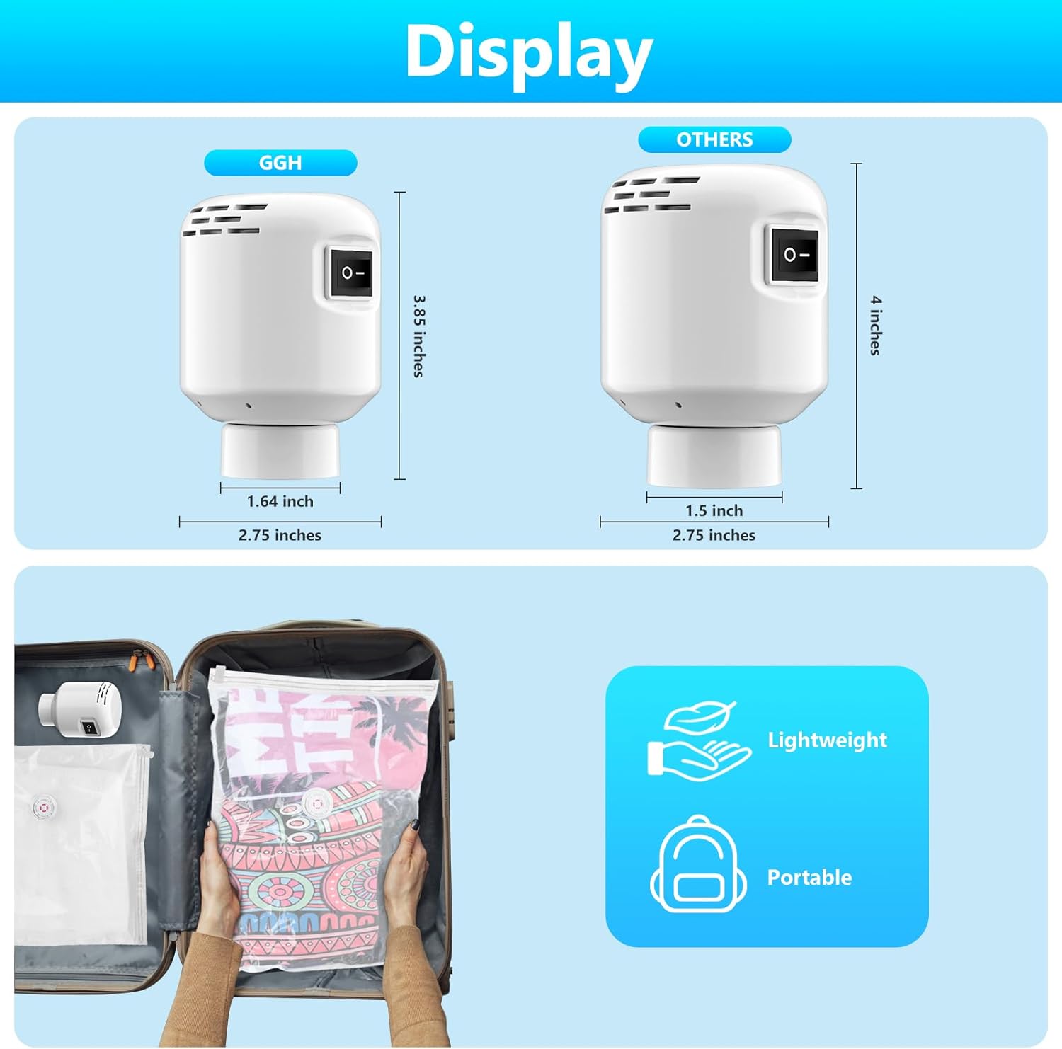 【Compact and Portable - GGH Travel-Friendly Design】GGH travel vacuum pump for vacuum sealer (ideal for clothes) features a compact, lightweight design that’s much smaller and more portable than other models. It’s easy to store in drawers, cabinets, or luggage when not in use, making it an essential tool for household space saving, travel, and protecting your belongings from dust and moisture.​