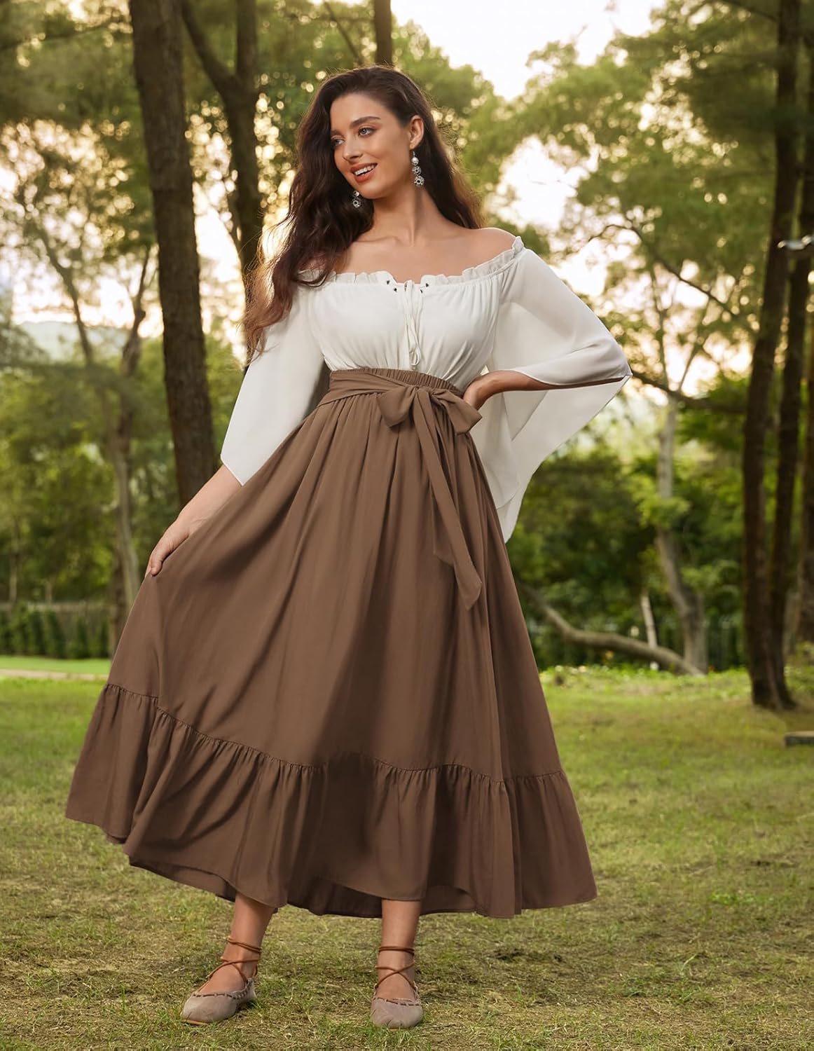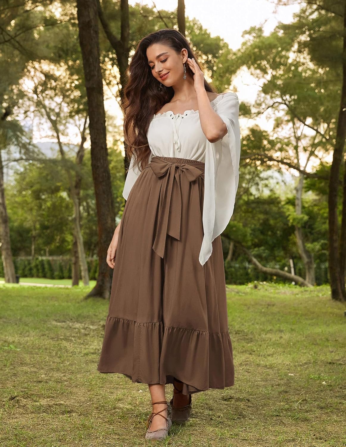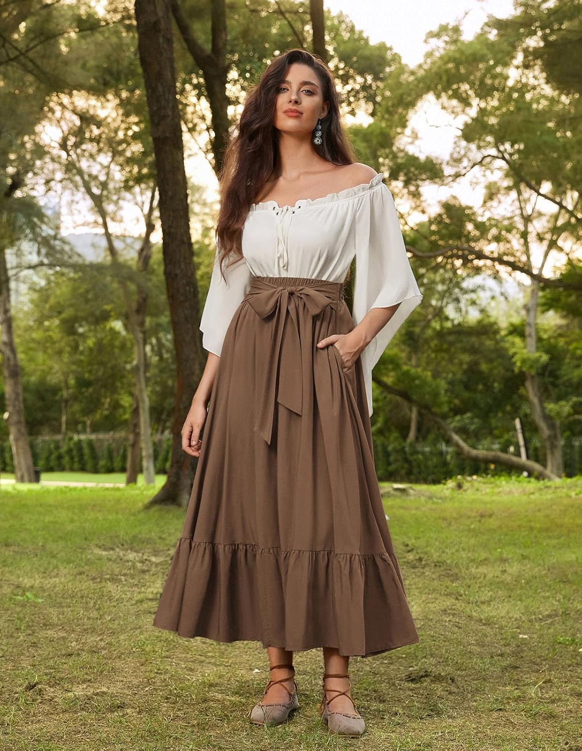 Scarlet Darkness Women High Waist Renaissance Maxi Skirt A Line Bow Front Long Skirt with Pockets