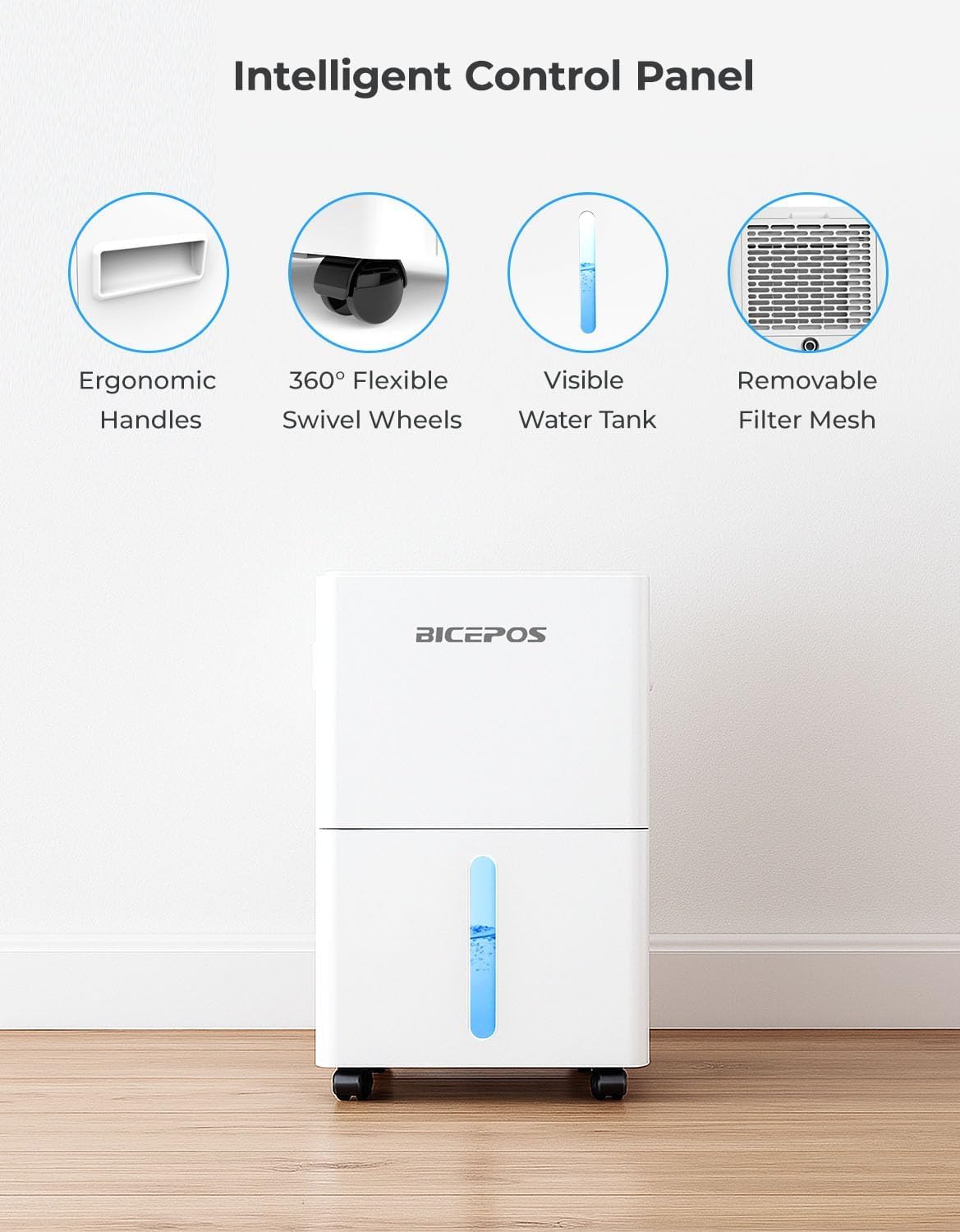 Dual Drainage Options - Bicepos dehumidifiers for home support two easy drainage methods: a removable water tank with a full indicator and a hose connection for continuous draining. Four smooth-gliding caster wheels allow you to move the unit effortlessly between different areas. The compact design and integrated handles make it easy to place in tight or elevated spaces. Our dehumidifier for bedroom provides flexible humidity management wherever needed