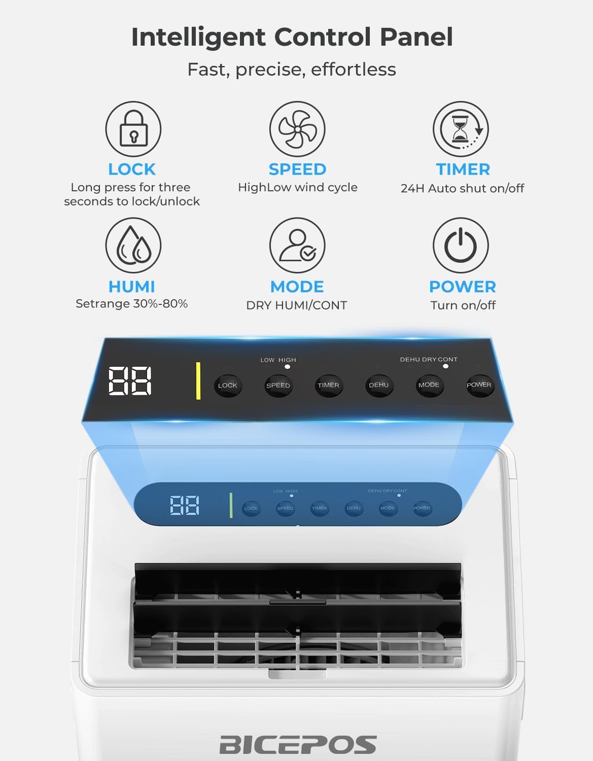Easy to Use - The clear control panel and digital display allow for easy setting of humidity levels and mode adjustments. Program the built-in timer to start or stop operation at set times, helping you manage energy usage according to your schedule. An intelligent humidity sensor automatically adjusts operation to maintain your desired comfort level while conserving energy. These features of the bathroom dehumidifier combine to provide an easy and convenient user experience