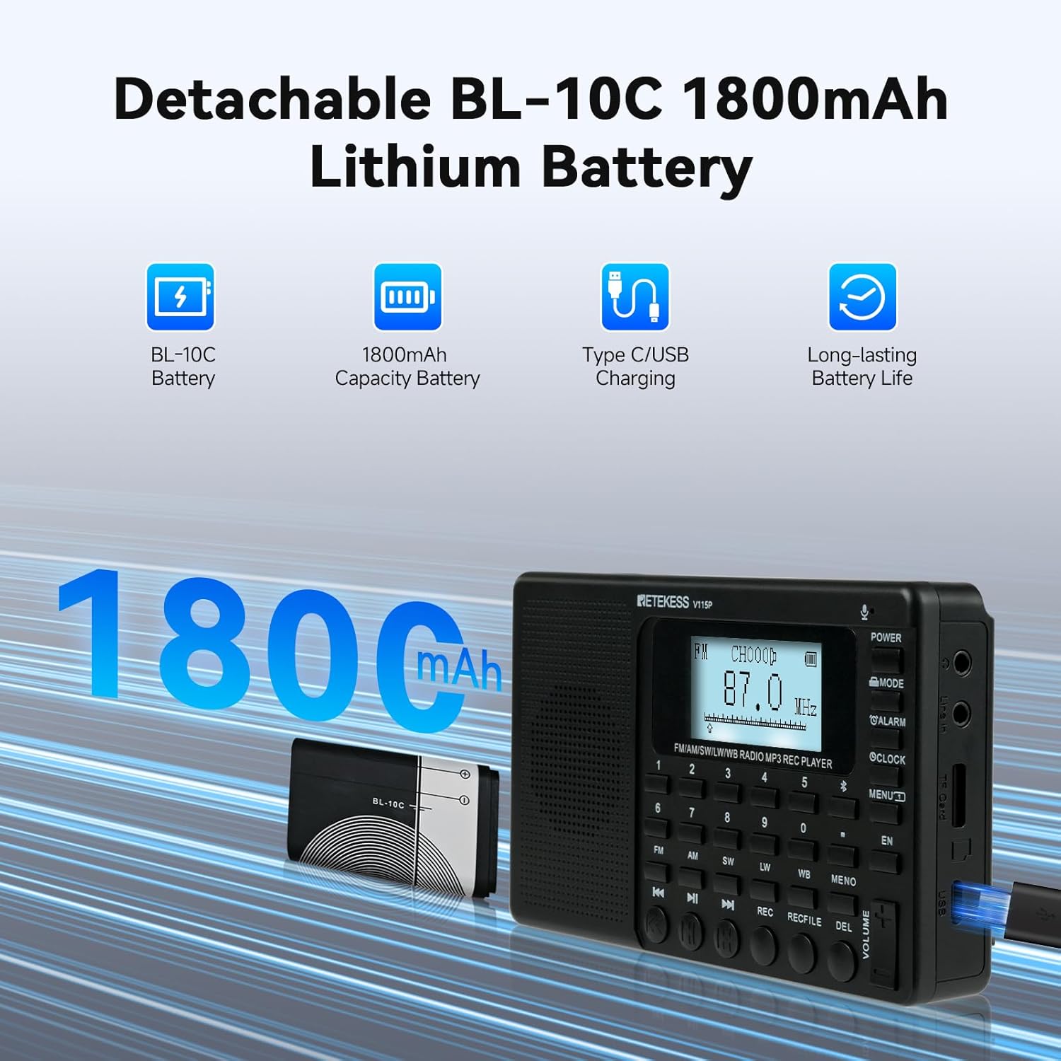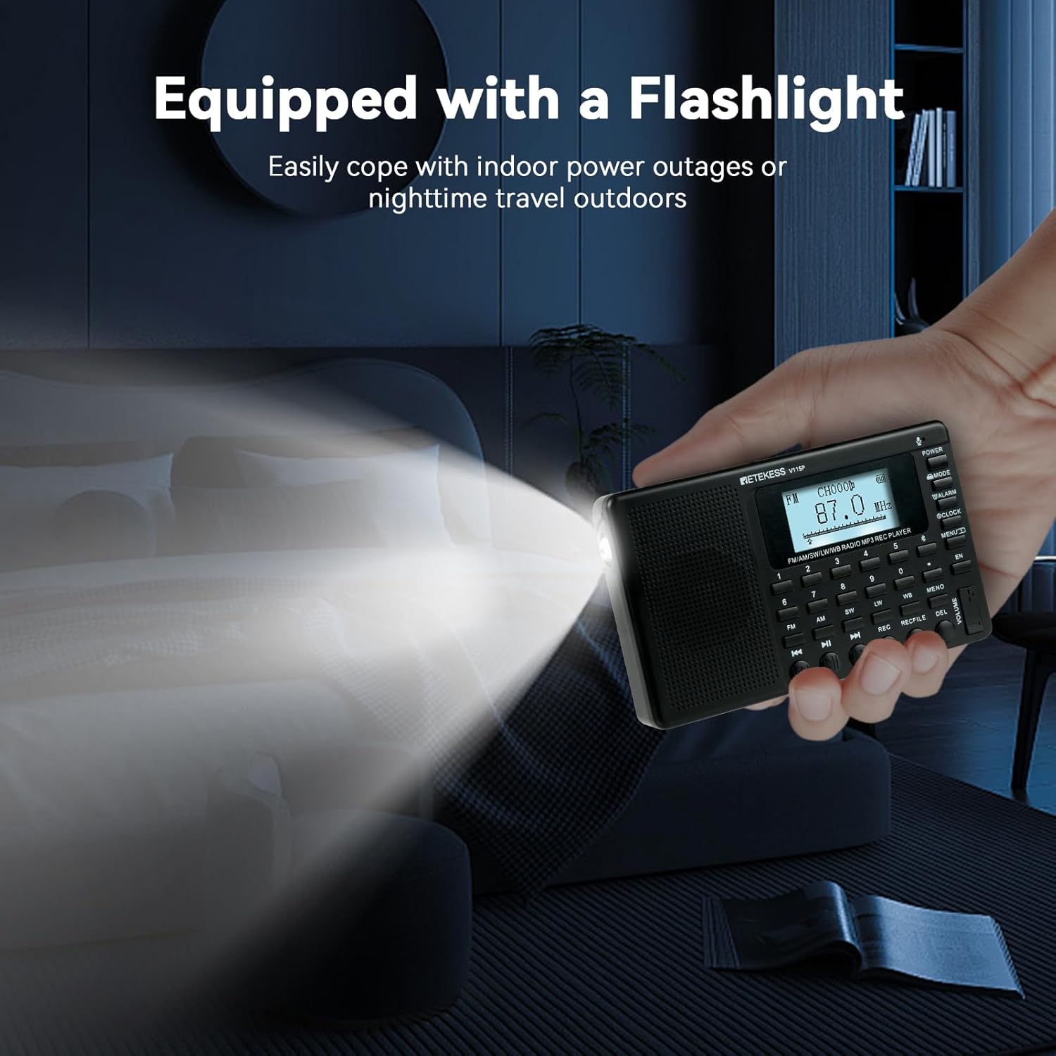 Multi-band Reception with Digital Tuning; Retekess V115P supports AM/FM/SW/LW/WB bands and features digital tuning for excellent reception; Whether at home; outdoors; or during emergencies; this shortwave radio ensures stable; clear signal reception for a reliable listening experience