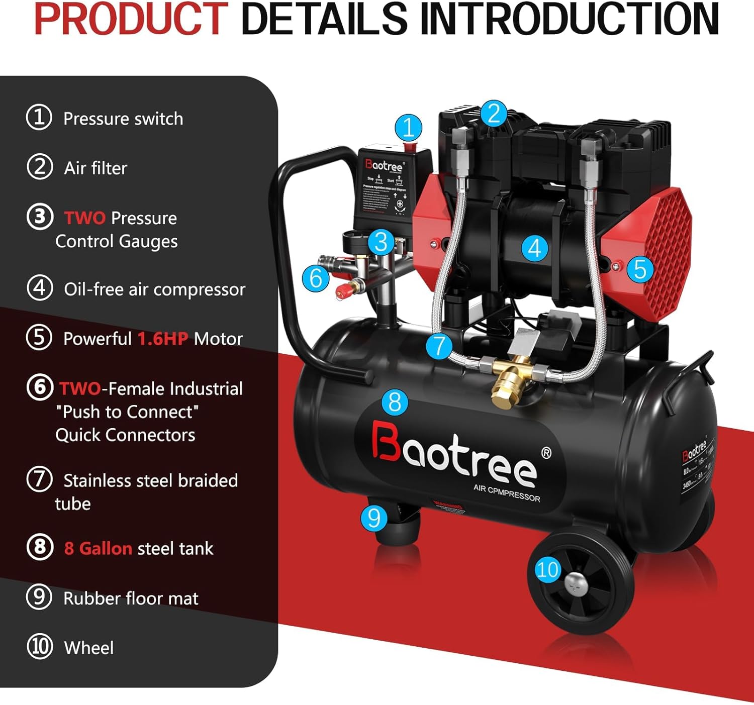 8 Gallon Ultra Quiet Air Compressor: Designed for easy mobility, this portable air compressor comes with a lightweight storage tank, handle, and wheels. It is powered by an 8-gallon pressure tank and a 1.5HP oil-less motor that operates at 110V, delivering 4.52 CFM at 115 PSI and 3450 RPM
