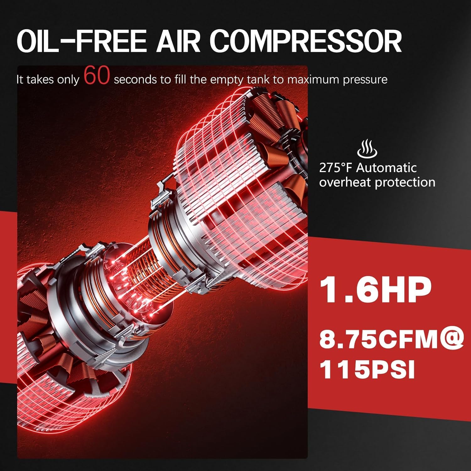 Safety Focused Air Compressor: The air compressor tank is equipped with two large cooling fans and automatic overheating protection to prevent damage. Additionally, the compressor will automatically shut off or provide pressure relief protection when the current or storage pressure is too high. When the internal pressure drops below 70 PSI, the motor will restart for approximately 33 seconds to ensure continuous use