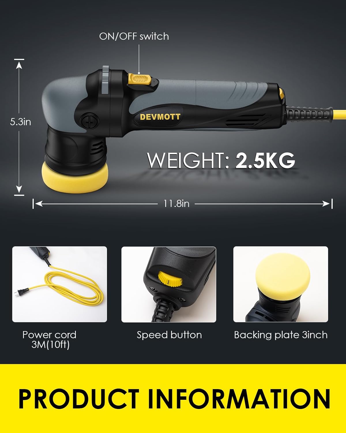 ✅【PRECISION AND POWERFUL】The DEVMOTT 3-inch Mini Polisher features a 750W high-torque motor for superior polishing efficiency. Its compact 3-inch backing plate effortlessly tackles tight spots (headlights, A-pillars, spoilers) and removes swirls, scratches, and oxidation with professional-grade precision