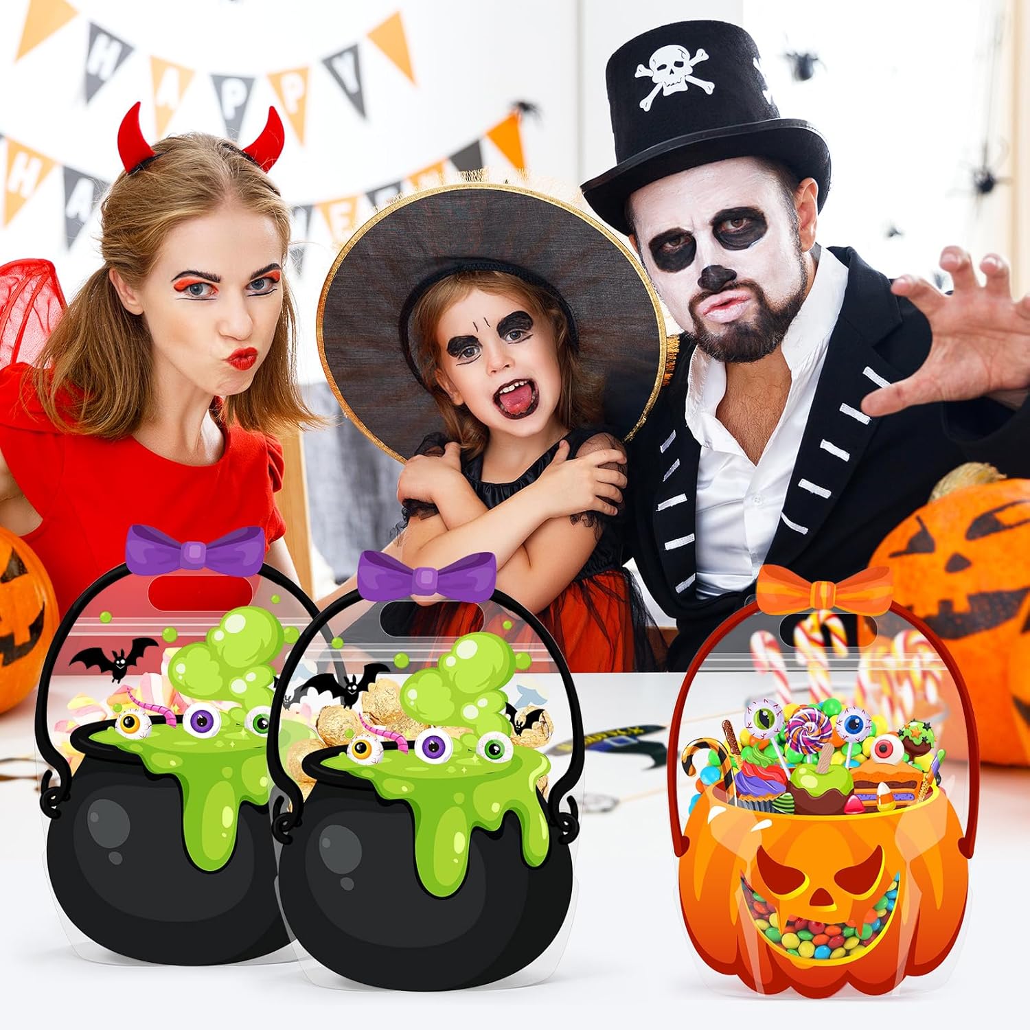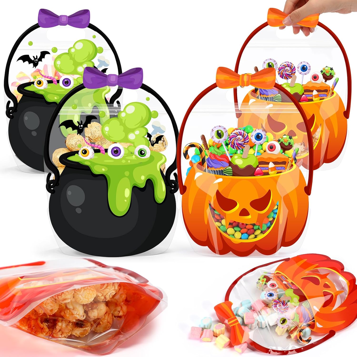 Exquisite Design: Halloween candy bags are designed in the shape of cauldron and pumpkin, adorned with witches' brew and snacks respectively, immerse yourself in the spooky charm of Halloween; The clear front window makes it easy to see the treats inside
