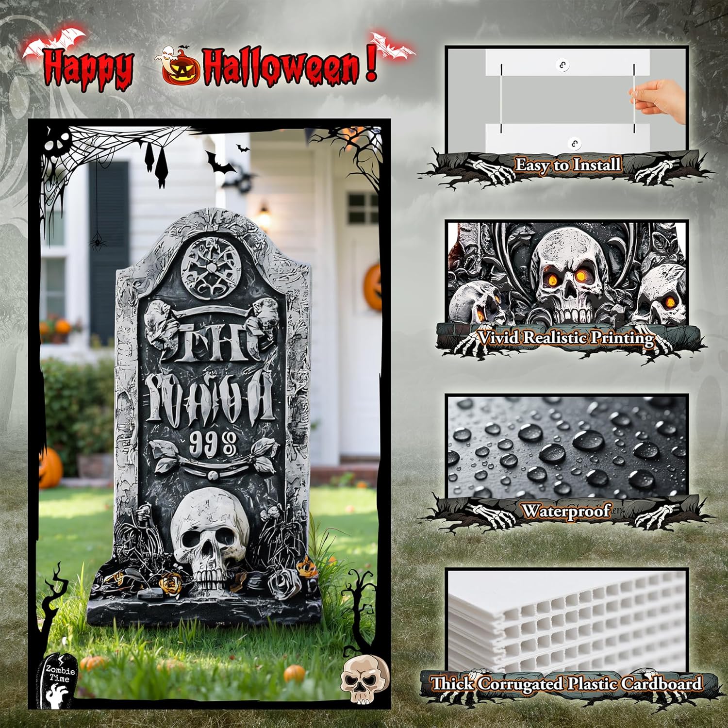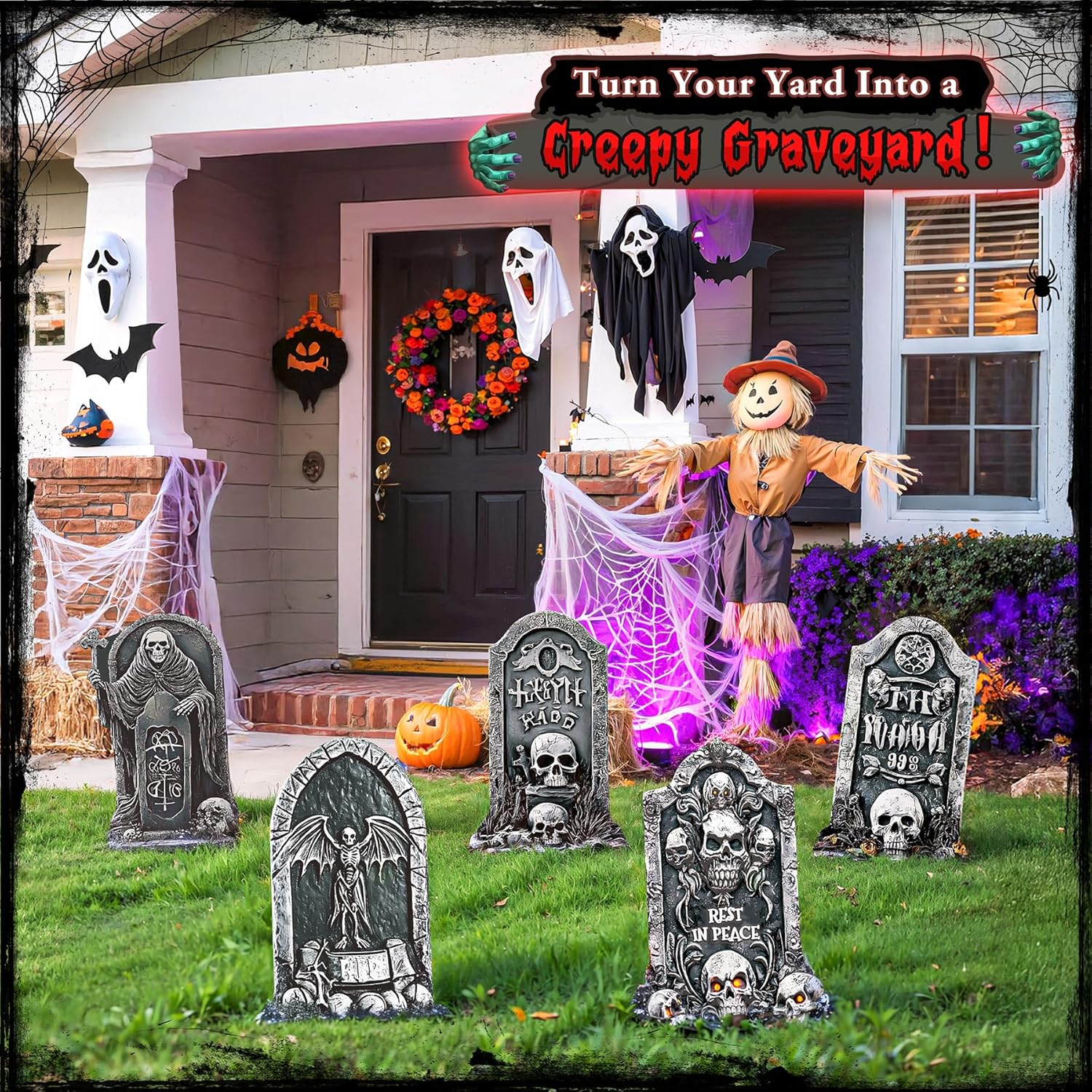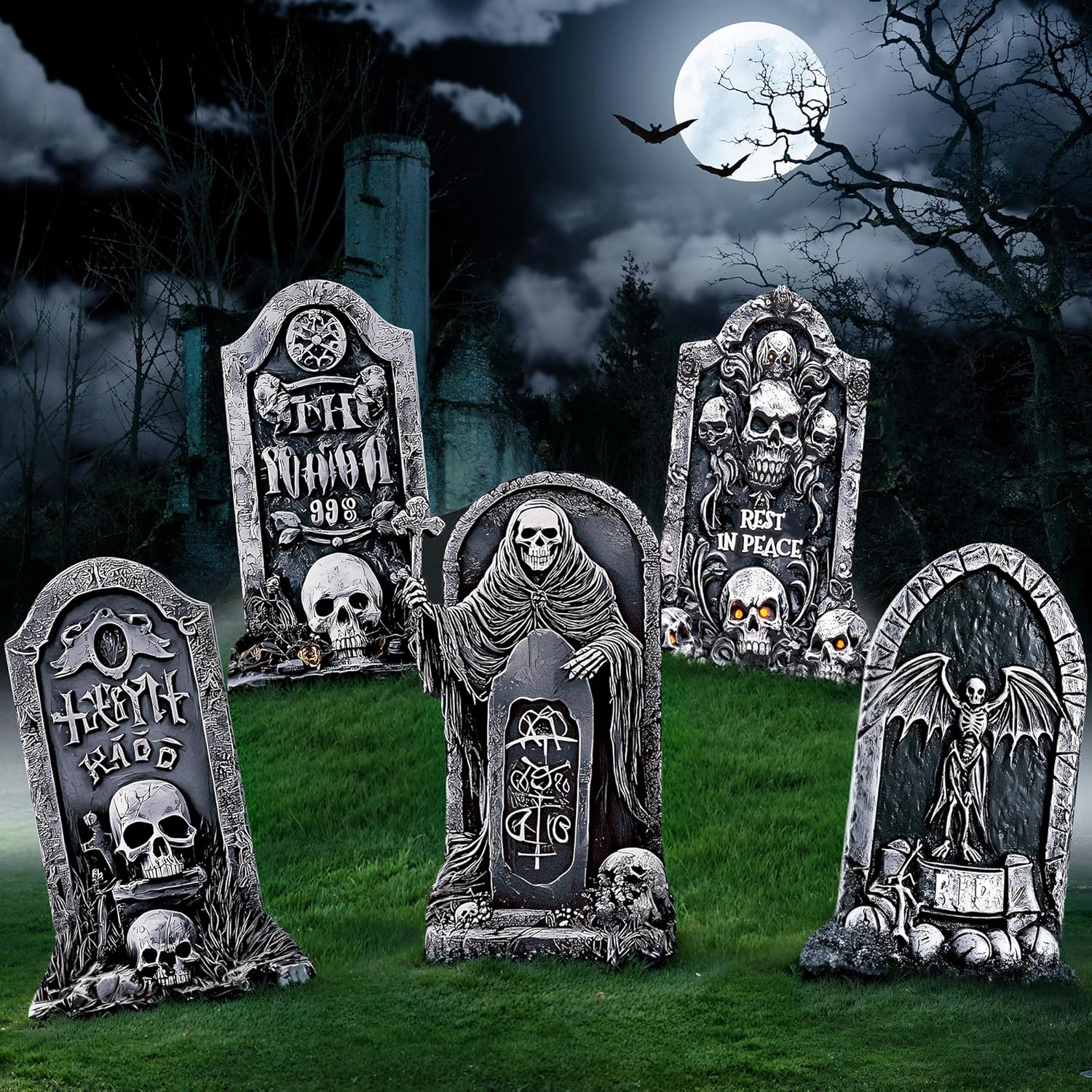 Realistic Designs: 5 unique Halloween gravestone styles feature crisp RIP letters, skulls and cracked stone patterns, spooky and fun, instantly turn your yard into a haunted graveyard; detailed designs creates a creepy cemetery scene that thrills trick-or-treaters and wows your guests
