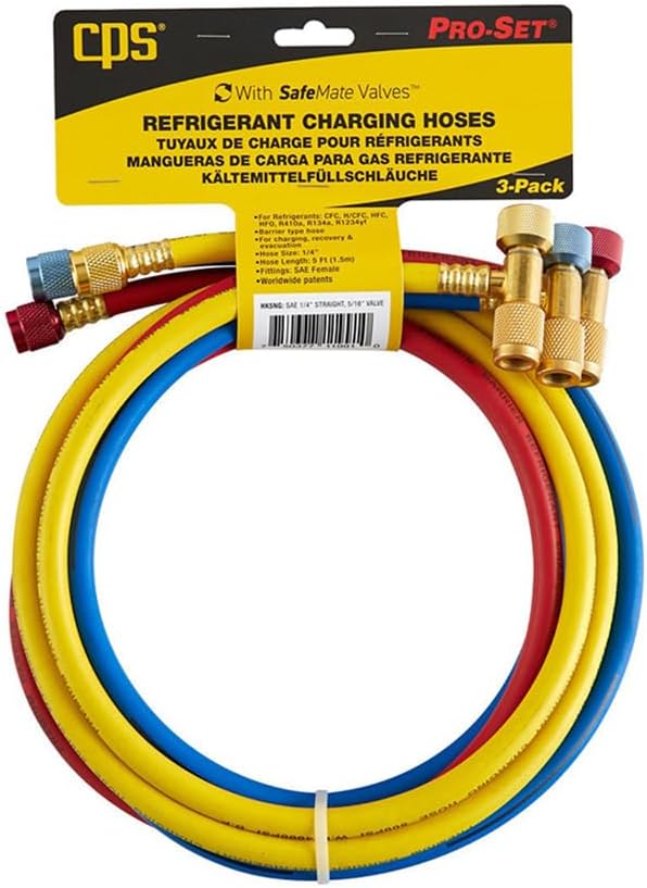 A convenient three-pack of CPS Products HK5NG 1/4″ patented 5 ft barrier hoses in red, yellow, and blue for safely and efficiently charging, recovering, and evacuating H/CFC, HFC, HFO, plus R410a, R134a, and R12234yf refrigerants in residential and commercial HVAC/R systems.