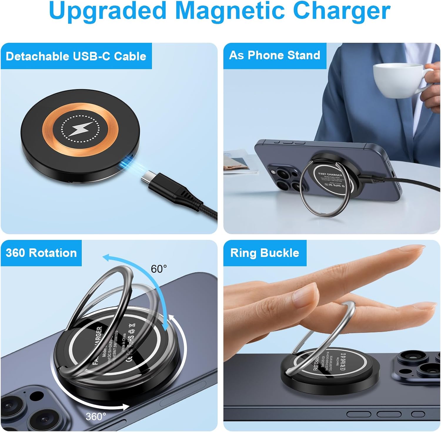 15W Magsafe Wireless Charger Pad Magnetic Wireless Charging Dock with Kickstand for iPhone 17 16 15 14 13 12 11 Series Android Phone Wireless Charging Station Fast Charging Wireless Charger Stand Provides 15W fast charging when using, 40% faster than other wireless charger pad. Built-in smart chip, automatically detect the best charging speed for your samsung s25/pixel 9 android phone. Kickstand & Non-slip Design Wireless Charger Dock with adjustable kickstand, makes the charging snap, perfectly accommodate the wireless earbuds to prevent falling. The silicone material on the top and bottom makes the charging more stable and your phone would not slide easily. Safe & Reliable Using professional charging technology, google pixel 9 8pro wireless charger supports foreign object detection, short circuit protection, overheat protection. Compatiblity: iPhone 17 Pro Max/Air/17/17 Pro/16 Pro Max/16 Plus/16e/16/16 Pro/15/15 Plus/15 Pro Max/15 Pro/14/14 Plus/14 Pro Max/13/13 Pro Max/12 Mini/11 Samsung Galaxy S25 FE/S25 Ultra/S25 Edge/S24 FE/S24 Ultra/S24 Plus/S23 Ultra/S23 FE/S23+/S22 Plus/S21 FE/S20/S10,Z Flip 7 6,Z Fold 7 6 5,Note 20/10 Google Pixel 9 Pro XL/9 Pro Fold/9/8a/8/8 Pro/7a/7 Pro/7/6 Pro/6/5XL/4XL/3 Moto G Stylus 5G 2025,Razr+ 2025,Edge 60 Pro,Edge 2025,Razr 60 Ultra,G Power 2025,G 2025,Edge 60,Edge 5G UW,G 5G,G Pure,G Play,One 5G Ace, G10/G9 Plus/G8 Power/G7/G6 USB C Fast Charger Block 20W PD 3.0 USB C port provides an optimized and high-speed safe charging experience for you, delivers up to 3A to give your samsung galaxy s25 plus phone power at a much faster rate, up to 3X faster than 5W charger. Detachable USB to USB C Cable Samsung Galaxy S25 Ultra Wireless Charger with integrated 3ft USB Type C fast charging cable makes charging your phone without conflict. Notes: 1.For better fast charging experience, please use a 20W or above PD adapter. And ensure your device support wireless charging 2.The magnetic function is just for iPhone. Do not attempt to charge incompatible devices 3.For other phones without magsafe function, must use our metal ring to fit 4.To ensure stable charging, please ensure your device on the center of the wireless charger pad