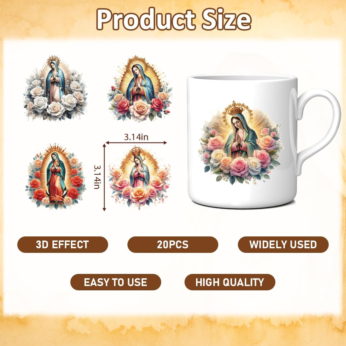 Guadalupe UV DTF Mug Wraps - 20 Sheets Virgin Mary Themed Uvdtf Tumbler Wrap for 16 oz Glass Water Bottle Watercolor Our Lady of Guadalupe Waterproof Rub On Transfer Decals for DIY Crafts Laptop