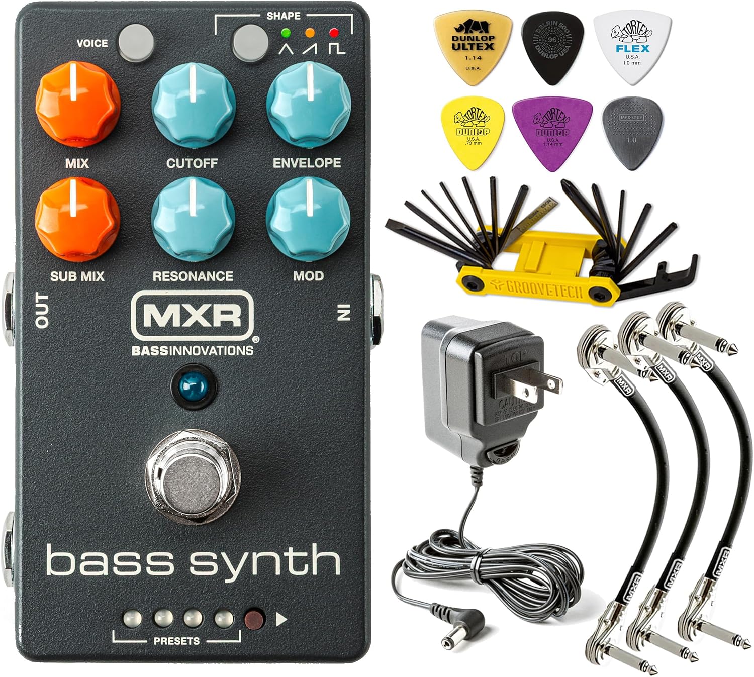 Comes with Tonebird bundle featuring ECB003 power supply, Groovetech guitar/bass multi tool, 3 MXR patch cables and Dunlop pick pack