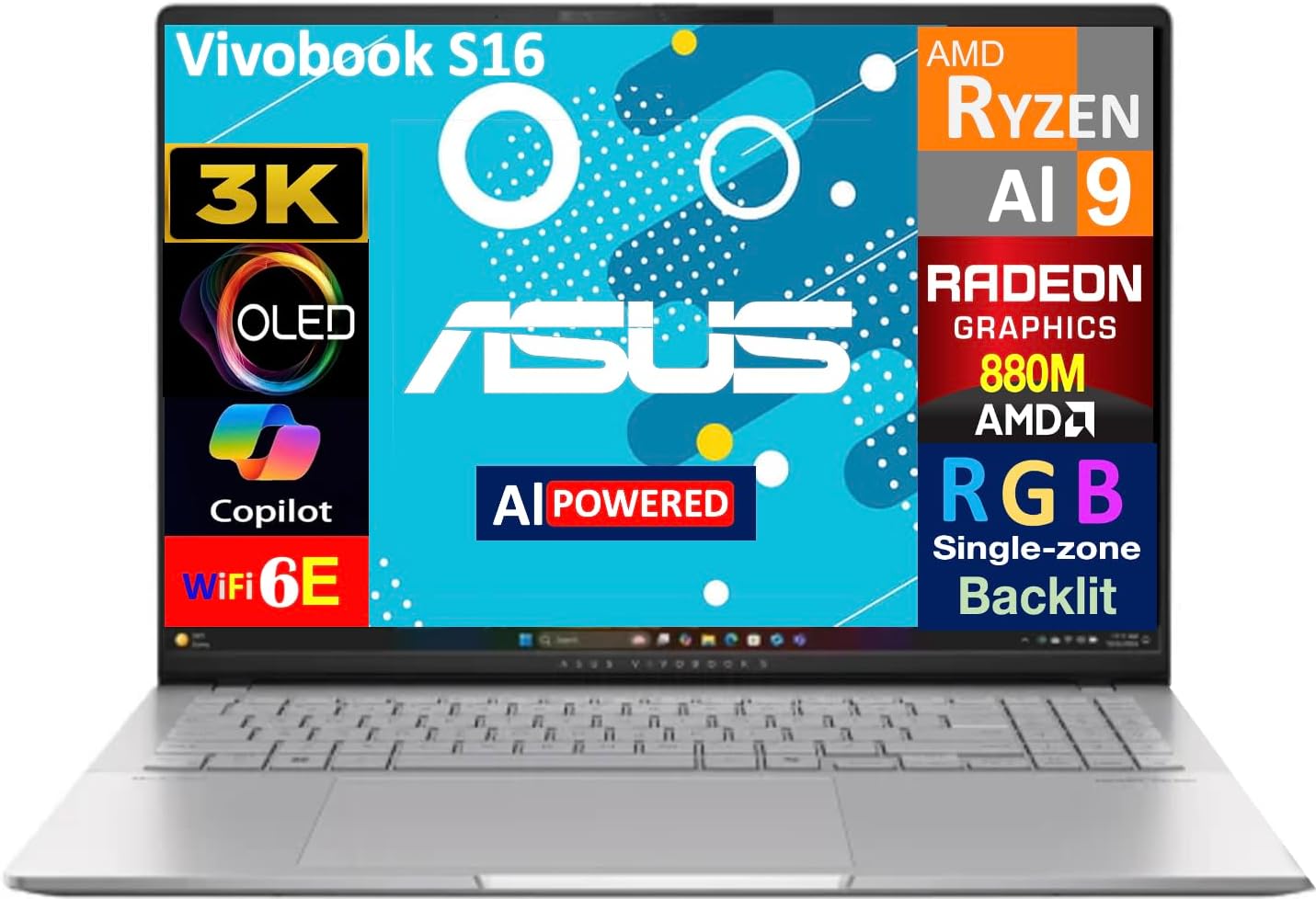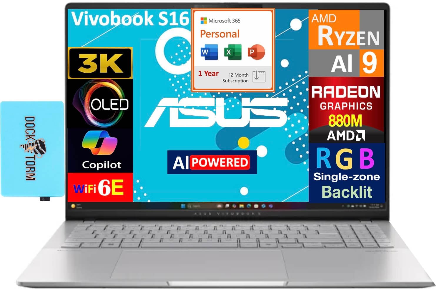 ASUS Vivobook S16 AI Powered Laptop 16.0" OLED 3.2K Display (AMD Ryzen AI 9 365, 32GB LPDDR5X, 1TB PCIe SSD, AMD Radeon 880M, RGB KB, Win 11 Pro) w/MS 365 Personal, DKZ USB Port Expander
