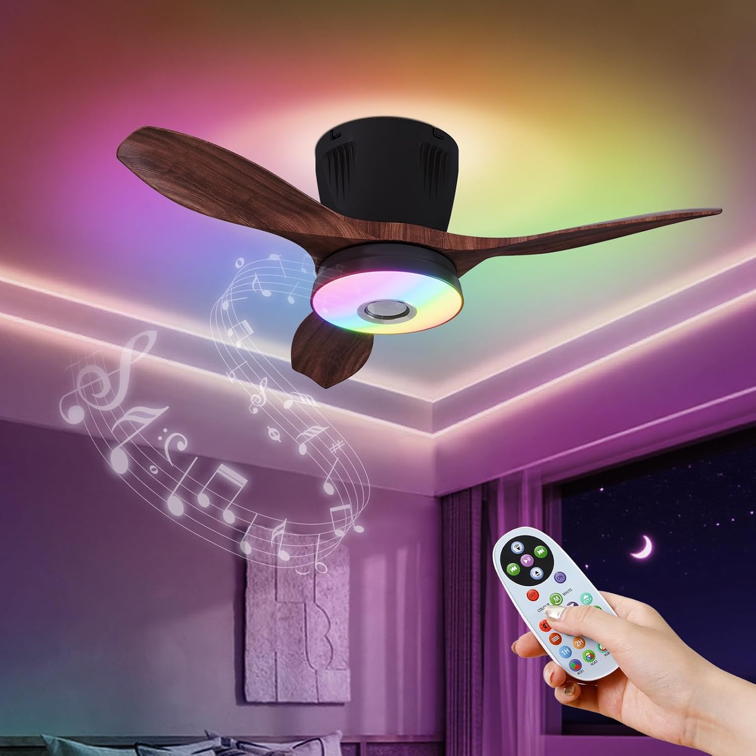 RGB Fan Light with Bluetooth Speaker, 21" Low Profile Ceiling Fan with Light Remote Control, 3CCT Stepless Dimmable, Night Mode, Memory Function, for Bedroom Living Room Kitchen Garage, Grain