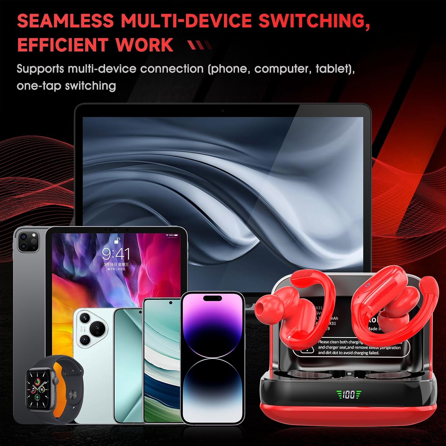 Wireless Earbuds Bluetooth 5.4 Headphones, Noise Canceling Ear Buds with 75hr Playtime, LED Power Display, IPX7 Waterproof Earphones Over-Ear Earphones for Sports/Workouts - Red