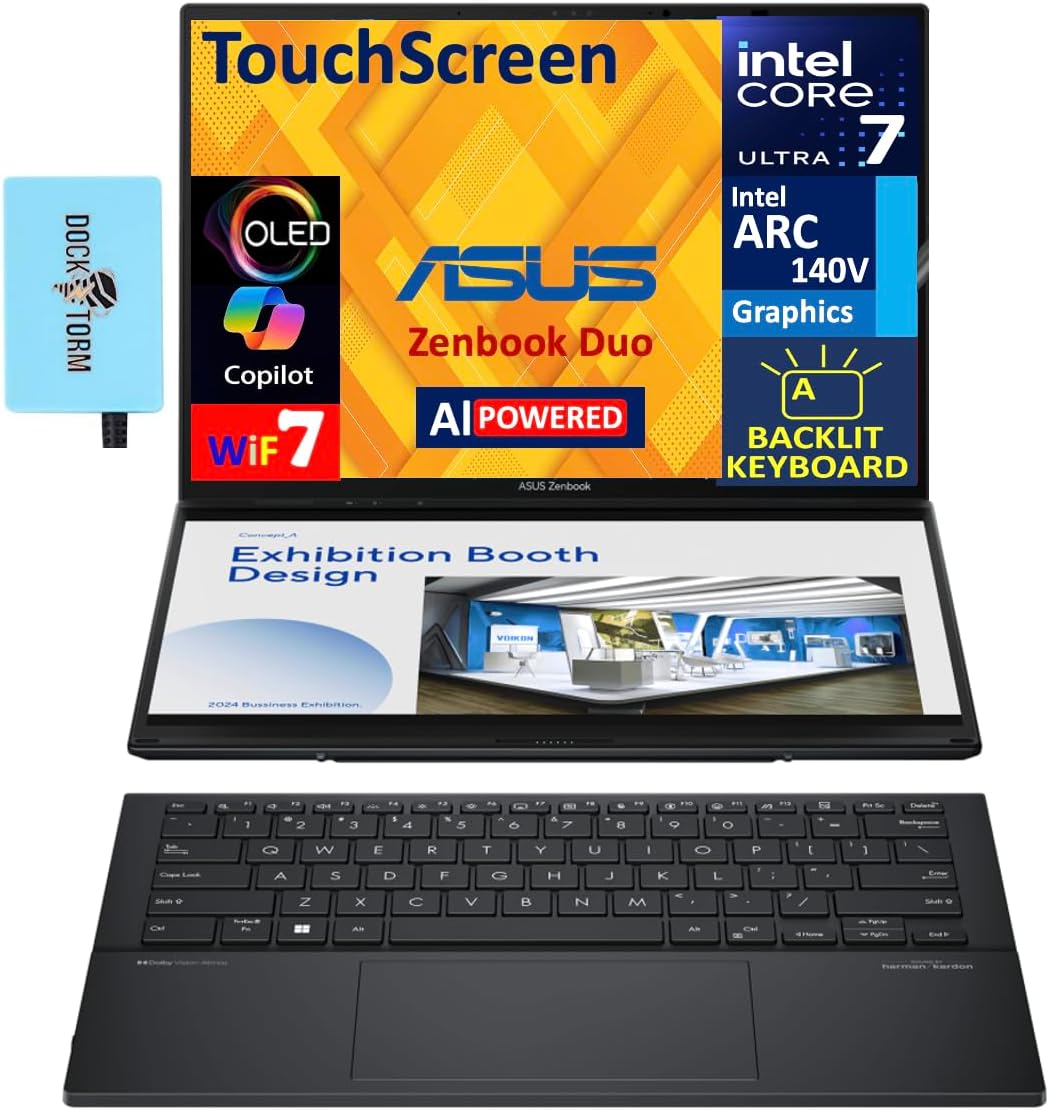 ASUS Zenbook Duo AI Powered 2-in-1 Laptop 14.0" Touchscreen OLED 2.8K Display (Intel Ultra 7-255H, 32GB LPDDR5X, 2TB PCIe SSD, Backlit KB, 2 Thunderbolt 4, WiFi 7, Win 11 Pro) w/DKZ USB Port Expander
