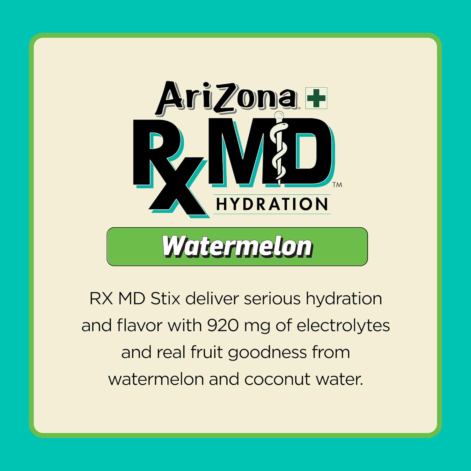 Stay refreshed with AriZona RX MD Stix, a hydrating blend powered by up to 930 mg of electrolytes and infused with real fruit like watermelon and coconut water.
