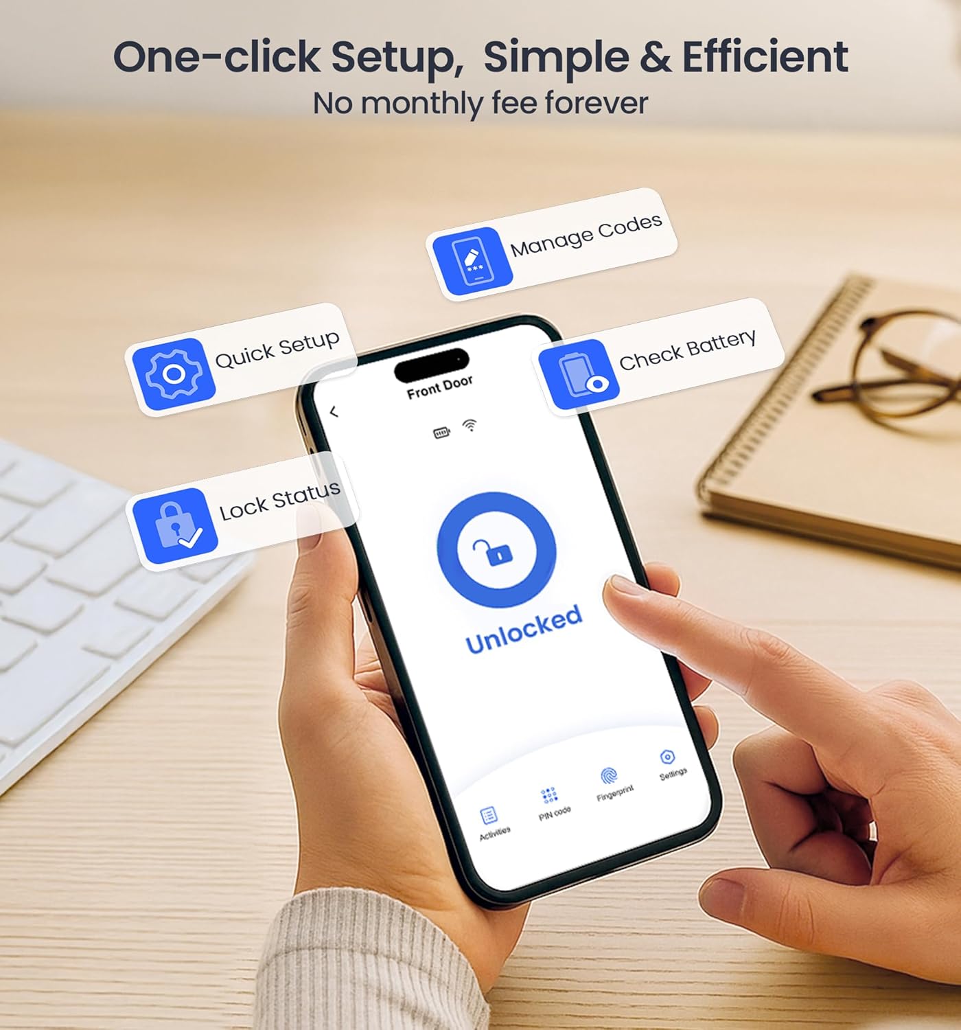 6 Smart Access Methods: This keyless door lock offers 6 ways to lock and unlock— App, Fingerprint, PIN Code, Voice Control, Auto-Lock, and Physical Key—delivering flexible, secure control