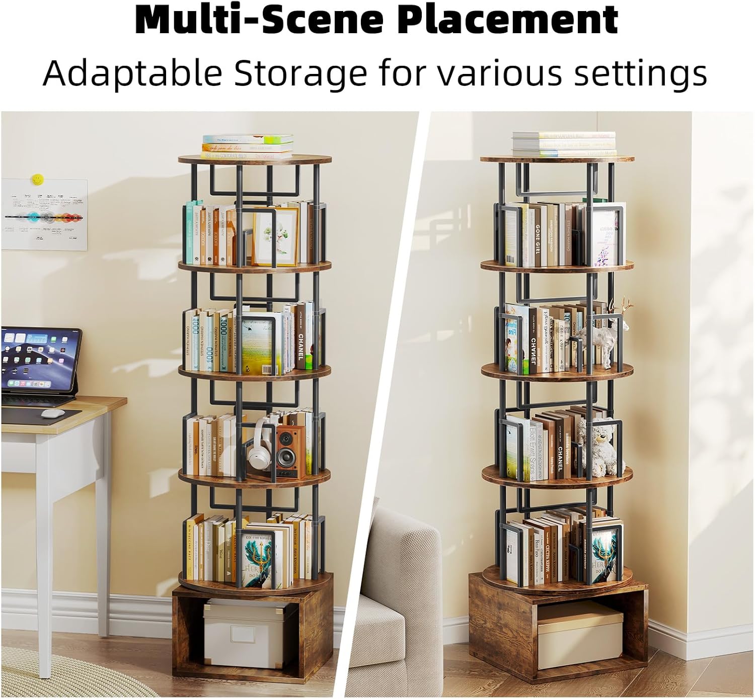 5 Tier Rotating Bookshelf with Extra Storage Cabinet, 360°Spinning Corner Bookshelf, Floor Standing Bookcase for Kids & Adult, Narrow Book Shelf for Bedroom Living Room, Vintage Brown