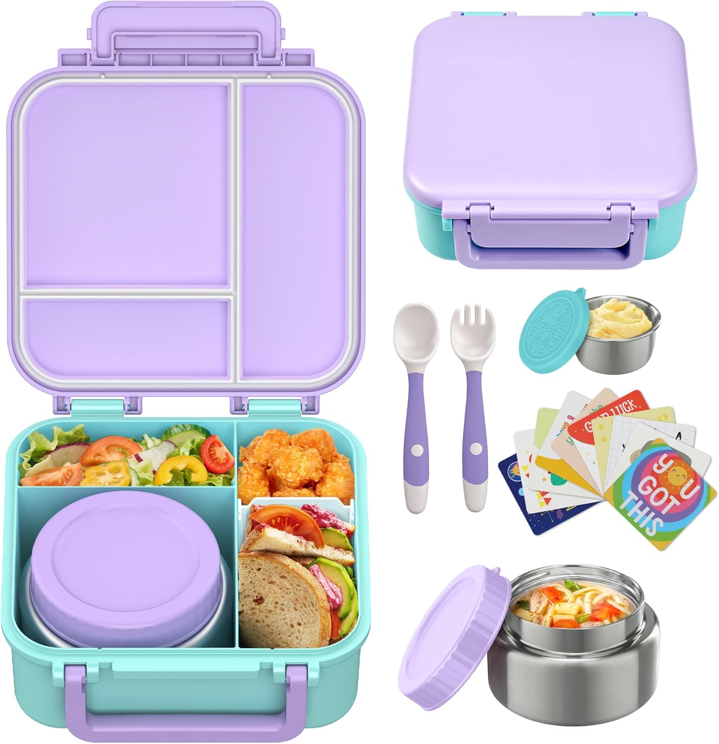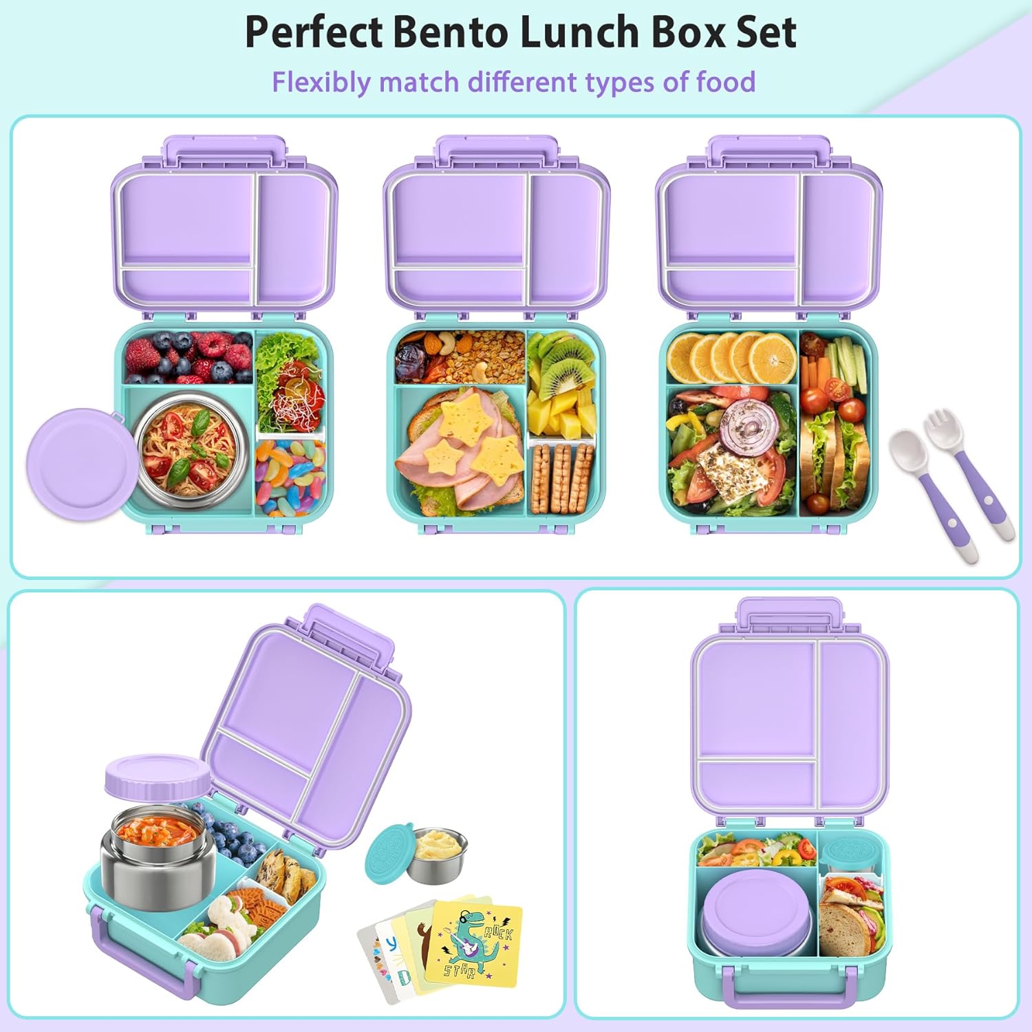 5pcs Kids Bento Lunch Box Set - kids lunch box set comes with a 44oz leak proof Bento Lunch Box, a 9oz hot food jar, a set of tableware, Stainless Steel Sauce Cups, Cute InspirationalLunch cards,Can meet the needs of all boys, girls, kids, and toddlers. Let kids have fun and nutritious lunches at school or on their travels