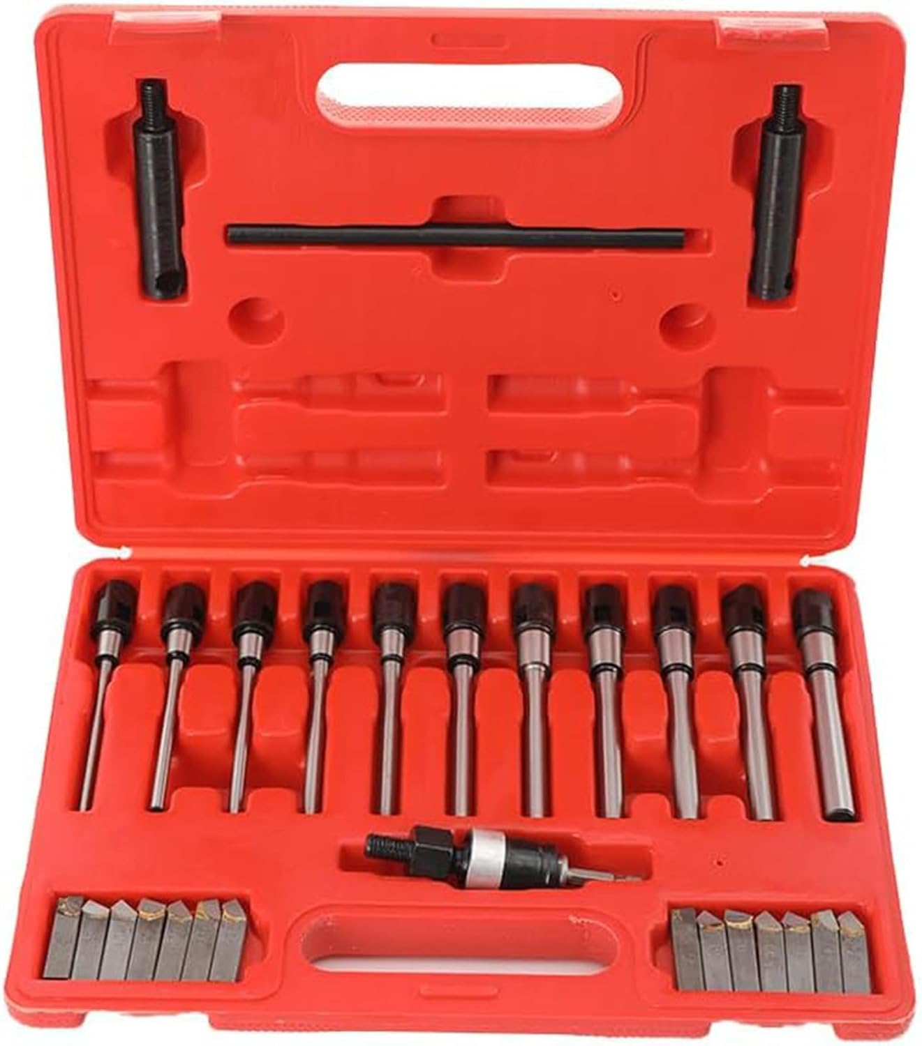Complete 29pc Kit for Multi-Vehicle Fleets:Includes 14 blades + 11 arbors( Tool bar diameter: 5MM, 5.5MM, 6MM, 7MM, 8MM, 9MM, 9.5MM, 10MM, 10.5MM, 11MM, 12MM) to service engines from compact cars (22mm) to heavy trucks (63mm). Compatible with F-ord, C-hevy, T-oyota, Ku-bota, and Jo-hn Deere models.