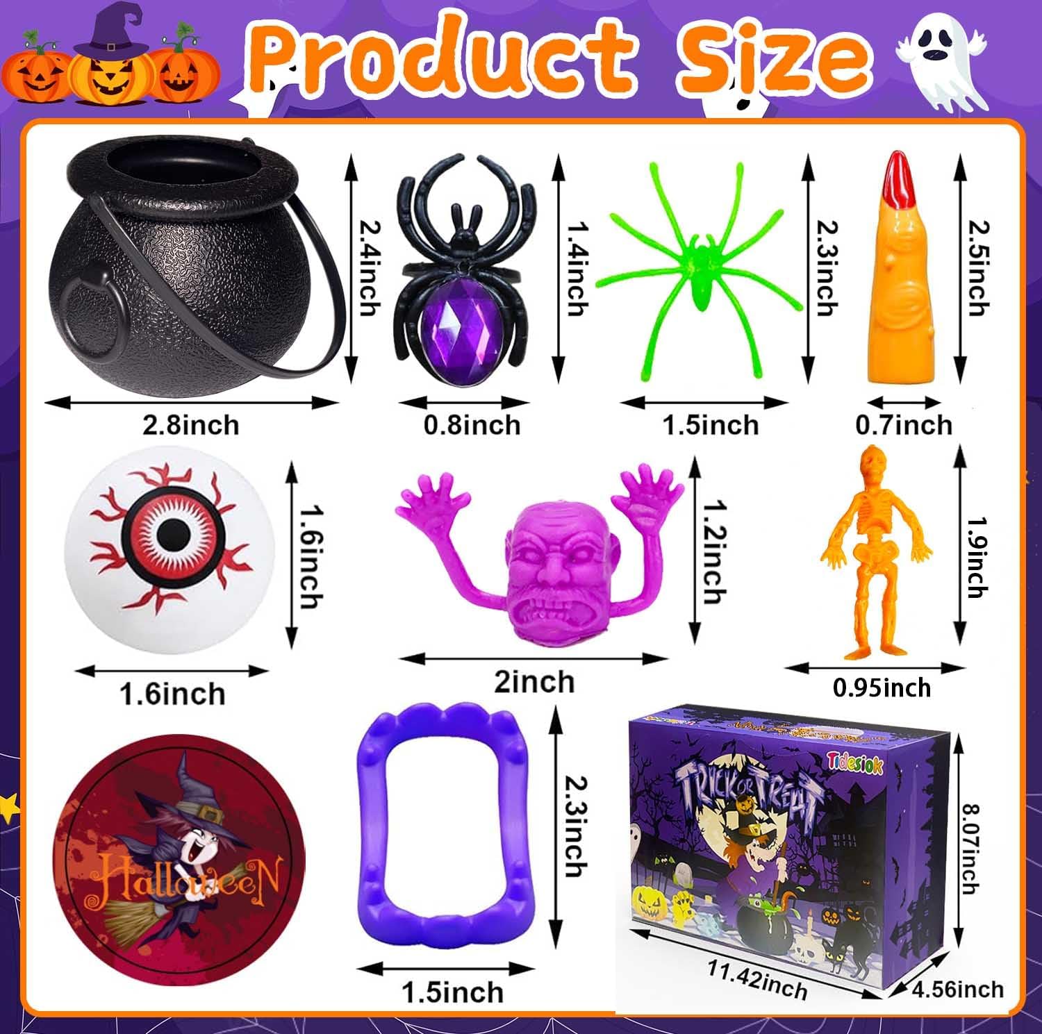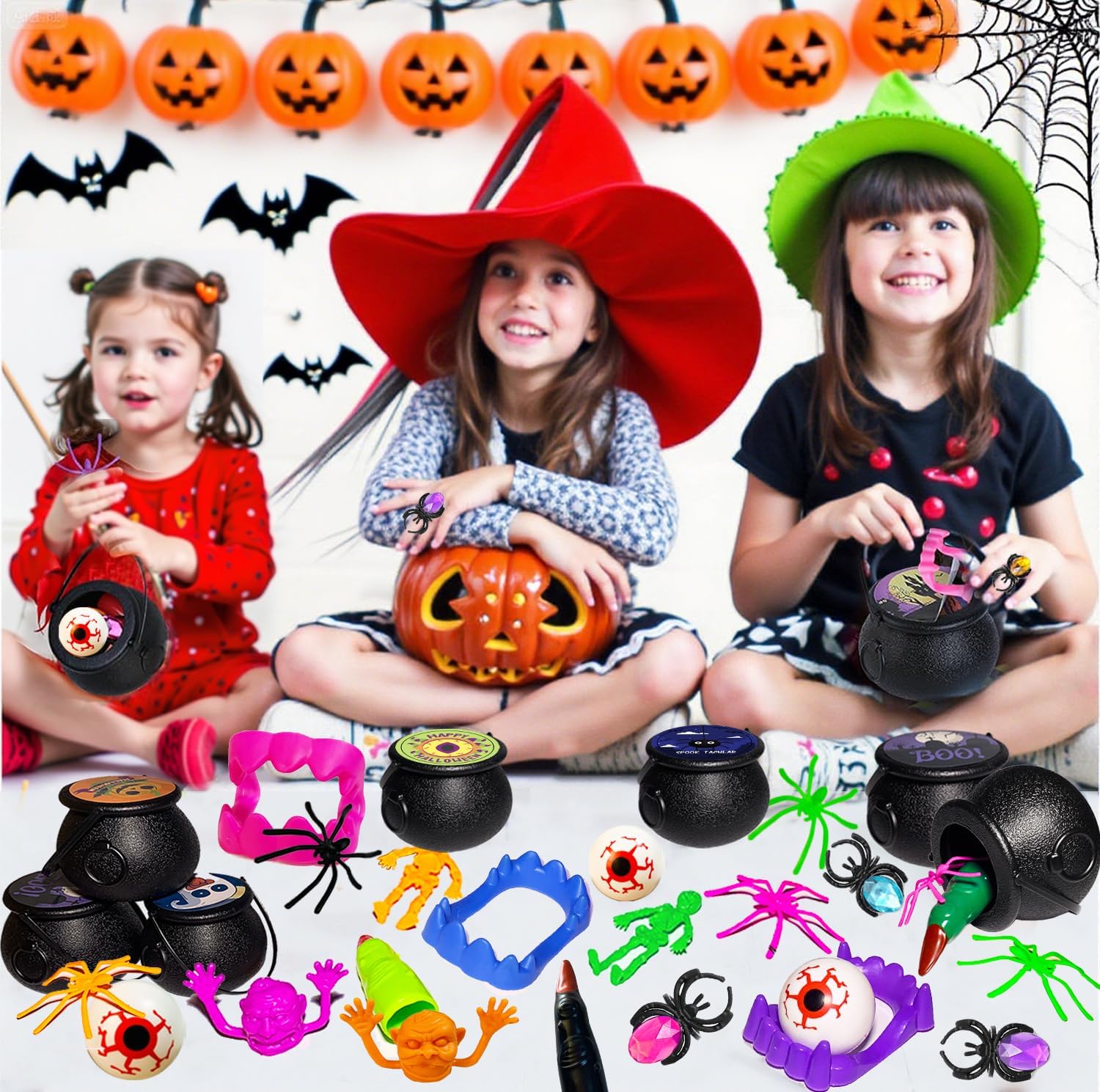 【Halloween Party Favors for Kids】 Halloween party favor set, containing 24 prefilled witch cauldrons. Each cauldron features a Halloween-themed sealing sticker and includes 7 types of Halloween toys: Halloween spider ring, Halloween skeletons, Halloween fake eye balls, Halloween witch fingers, plastic spiders, Halloween teeth, and ghost finger puppet toys. Total of 216 pieces (including stickers). Halloween party favors for kids, halloween trick or treat toys.
