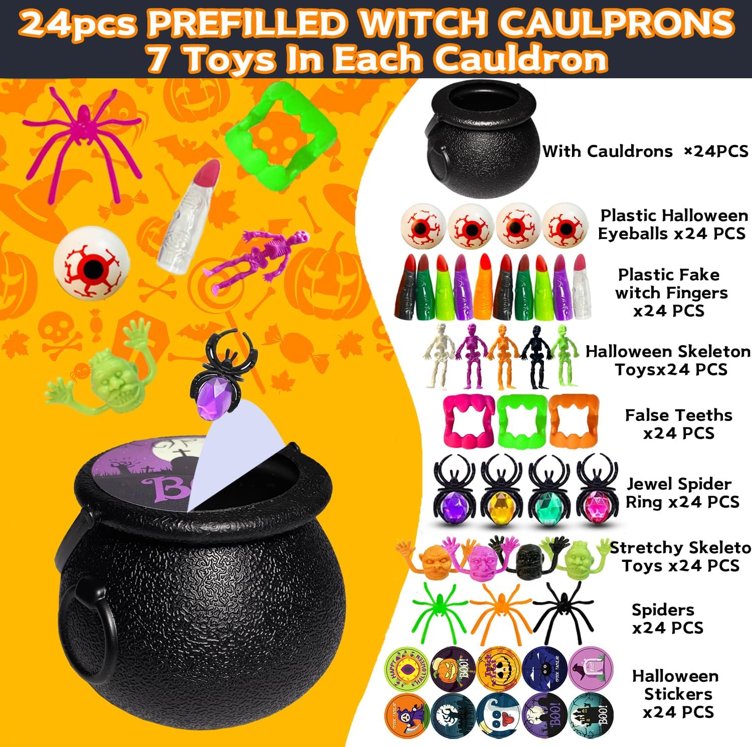 216 PCS Halloween Party Favors for Kids, 24 Prefilled Plastic Witch Cauldron Halloween Goodie Bags Stuffers Halloween Treats Non Candy Classroom Prize Halloweens Trick or Treat Toys