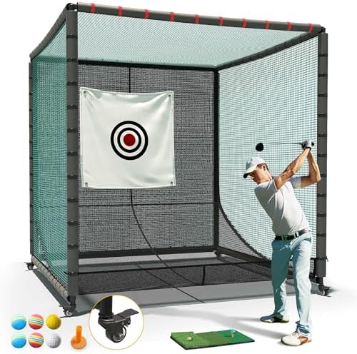 Golf Cage Net with Wheels, Upgrade Driving Hitting Cage with Metal Frame, Golf Practice Net for Full Swing and Chipping Backyard Indoor Outdoor Lawn(Includes 1 Hitting Mat 6 PU Balls 1 Tee)