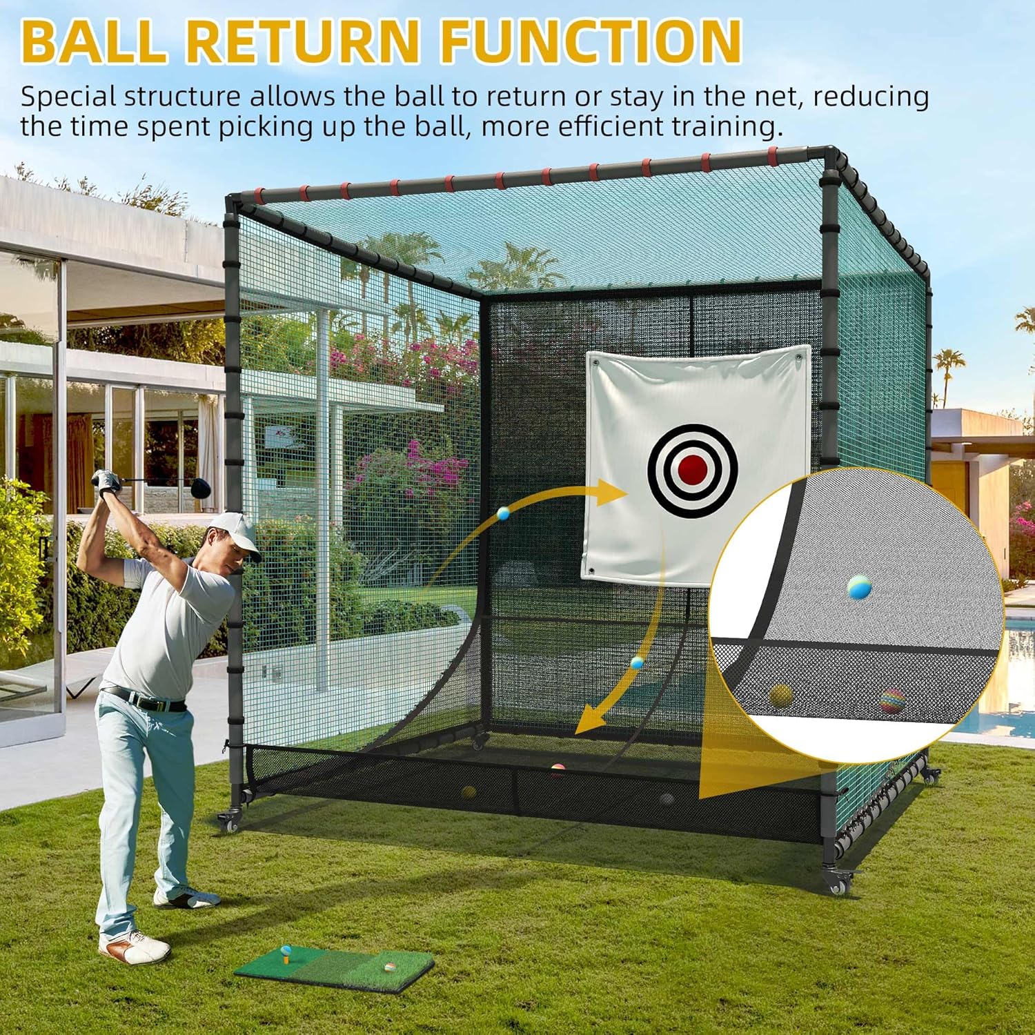 Function upgrade: Our large golf cage, now with 4 detachable swivel wheels, offers easy mobility. It features a ball return net to prevent ball drops and a 5x5 foot target cloth for enhanced shooting accuracy. Elevate your practice with improved functionality and experience