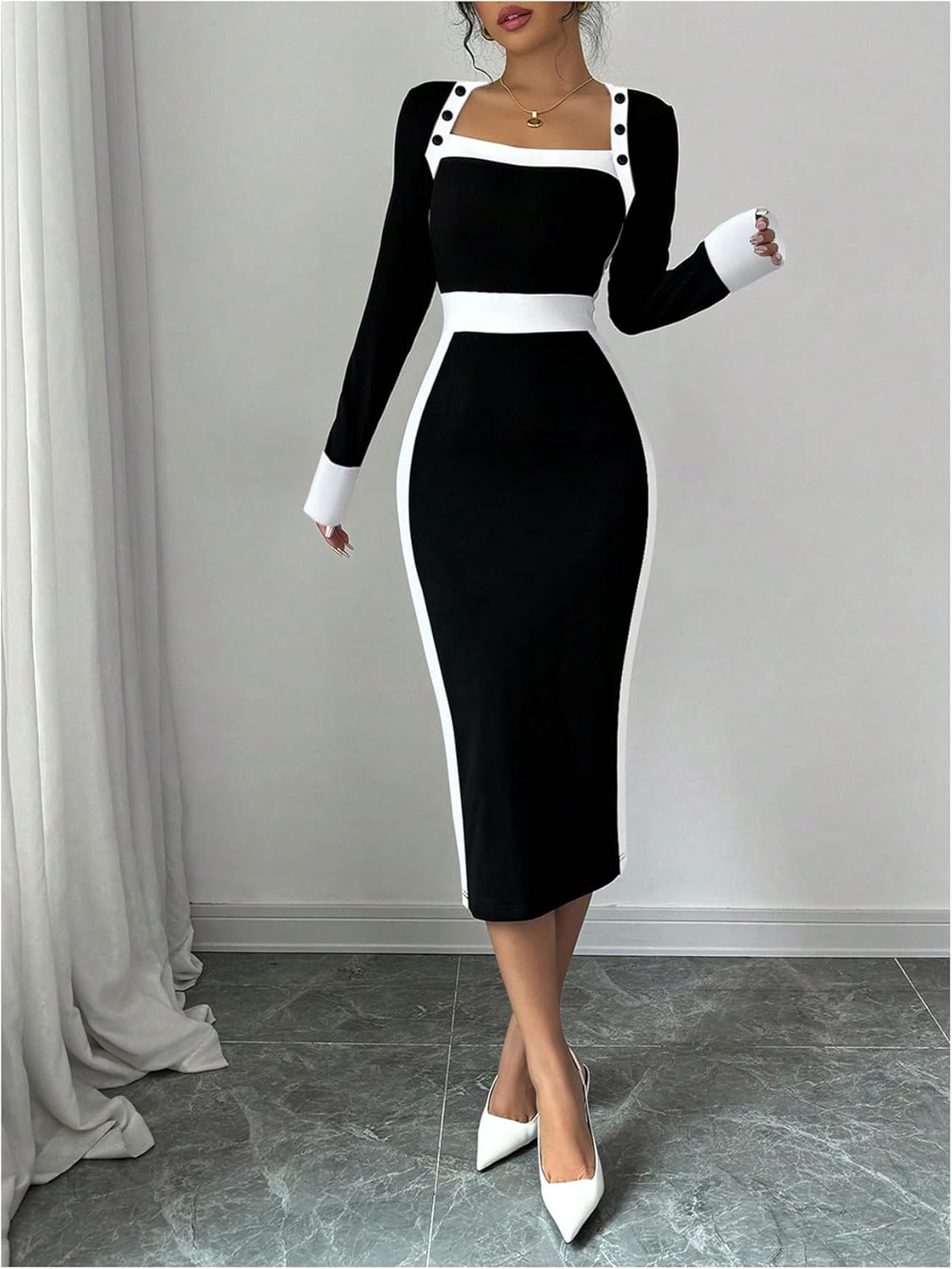SOLY HUX Women's Long Sleeve Square Neck Bodycon Elegant Midi Dress Pencil Cocktail Party Dresses