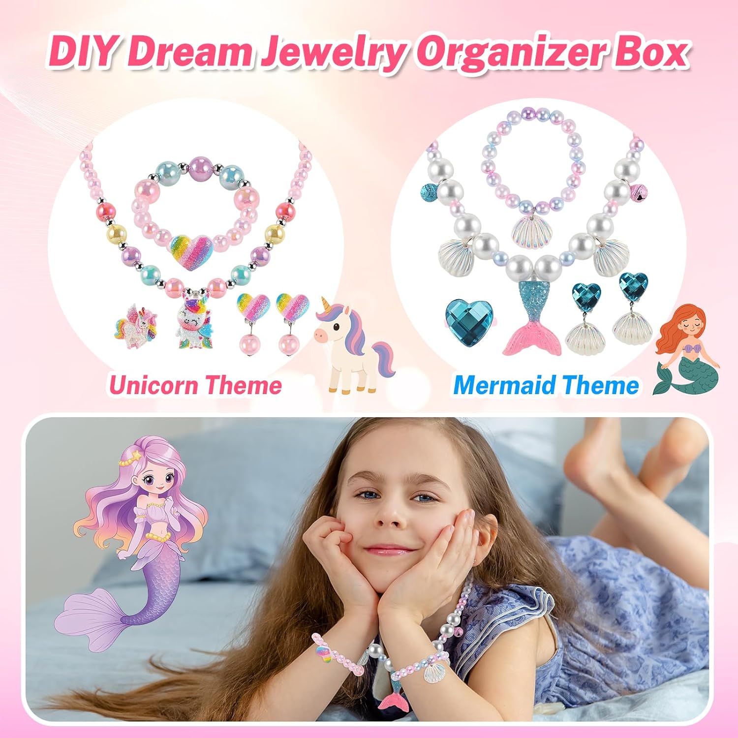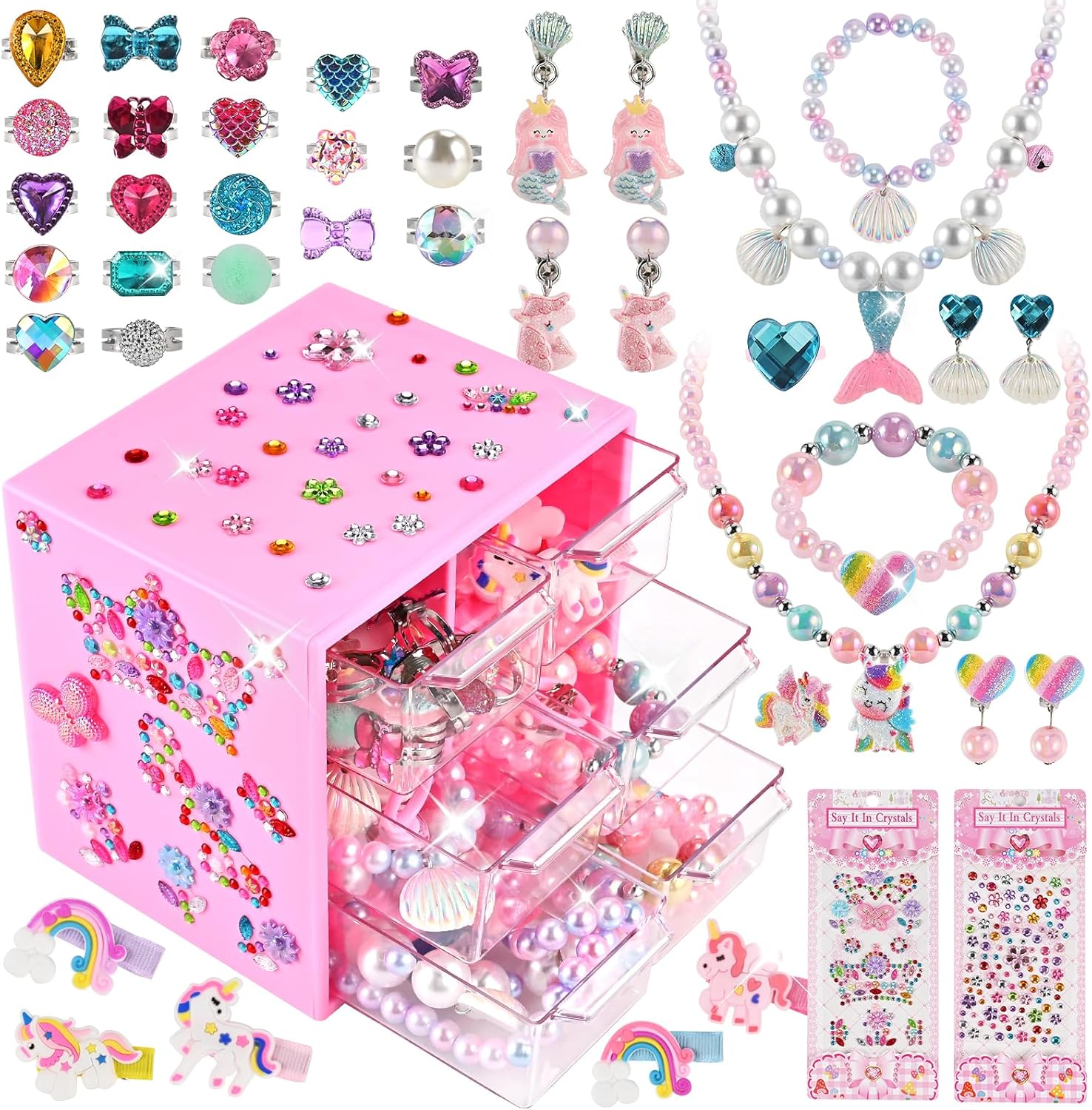 42PCS Jewelry Toys for Girls, Unicorn Mermaid Princess Toys- Rings, Clip on Earrings, Necklaces, Hair Clips, DIY Stickers, Box, Toddler Kids Play Jewelry for Girls 3-5 6 7 8 9 10+ Christmas Birthday Gifts