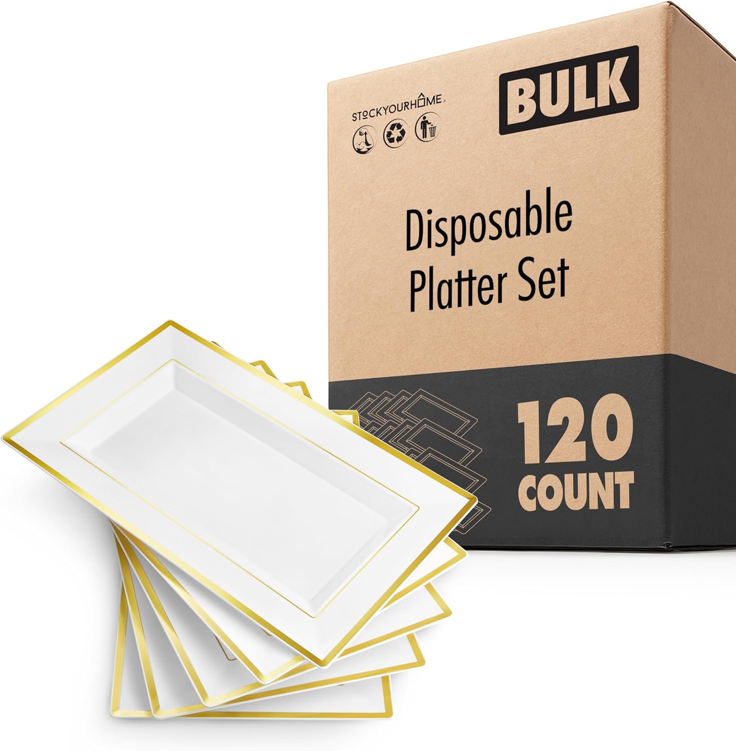 (120 Pcs) Premium White and Gold Plastic Serving Tray, Plastic Serving Platter Disposable, White Rectangle Party Trays and Platters for Fruit, Dessert, Cookies, Appetizers, Holiday Parties