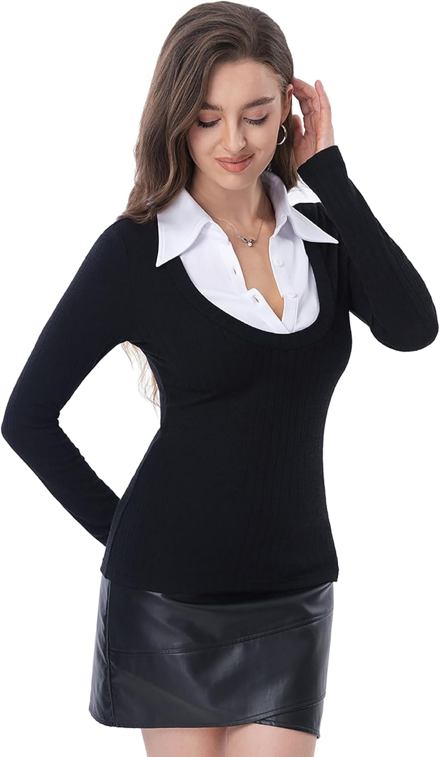 AmélieBoutik Women Office Lady Faux Shirt 2 in 1 Style Long Sleeve Pullover Blouse Button Up Top