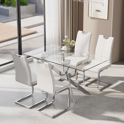 5-Piece Dining Table Set for 4, Modern Rectangular Glass Table with 4 Upholstered Leather Chairs, Space-Saving Dining Room Furniture Table & Chair Sets for Small Spaces&Apartment(White&Silver)