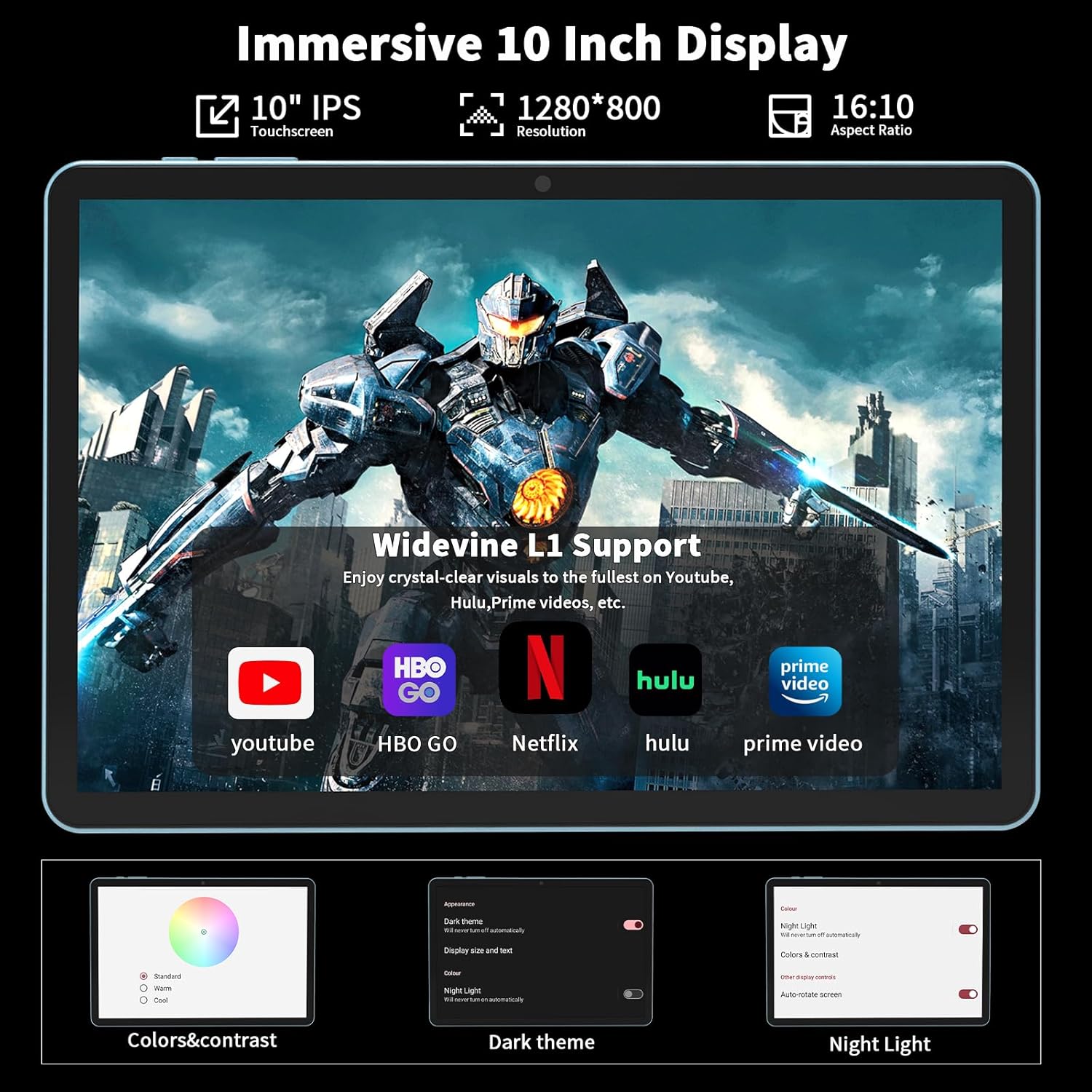 【Octa-Core & Dual Camera】Powered by the octa-core T606 processor,this 10 inch tablet redefines speed with faster processing and smoother multitasking.The 13MP rear camera and 5MP front camera help you capture life's beautiful moments with greater clarity.