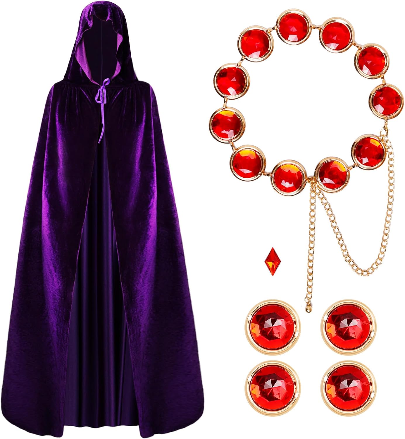 You will receive a purple cape, red gemstone belt, four round red gemstones and a diamond shaped gemstone, fully fitting a variety of cosplay features to meet the needs of your participation in the Halloween party, and all are made of good and reliable materials such as velvet, metal, etc., with fine workmanship, soft and comfortable to wear, smooth surface, bright colors, not easy to fade or break, suitable for most men and women, can be used repeatedly for a long time, you can refer to the picture size information before buying. Specification Quantity:7Pcs Material:Velvet,metal Style:Purple Cape and Raven Belt Sets Women's Halloween Cosplay Costume Weight:500g Color:Purple Red Product Features Our cape ruby belt set is versatile, ideal Halloween dress up costume, a unique collection of closet must-haves, can be worn alone or with family and friends, all come to endless joy, and is perfect for Halloween, Christmas, Easter, Mardi Gras, masquerade, stage shows, costume parties, renaissance themed parties, cosplay and more occasions and events, stand out in the crowd, and each accessory is a fashionable wearable piece, free to mix and match, let you keep your personality trendy every day. Warn Tips Product size are manually measured,due to different measurement angles, inevitably there are errors, please prevail in kind. The color may exist slight difference due to different screen display. If you have any questions about our products, we will provide you with a satisfactory solution, thank you for your support and understanding.