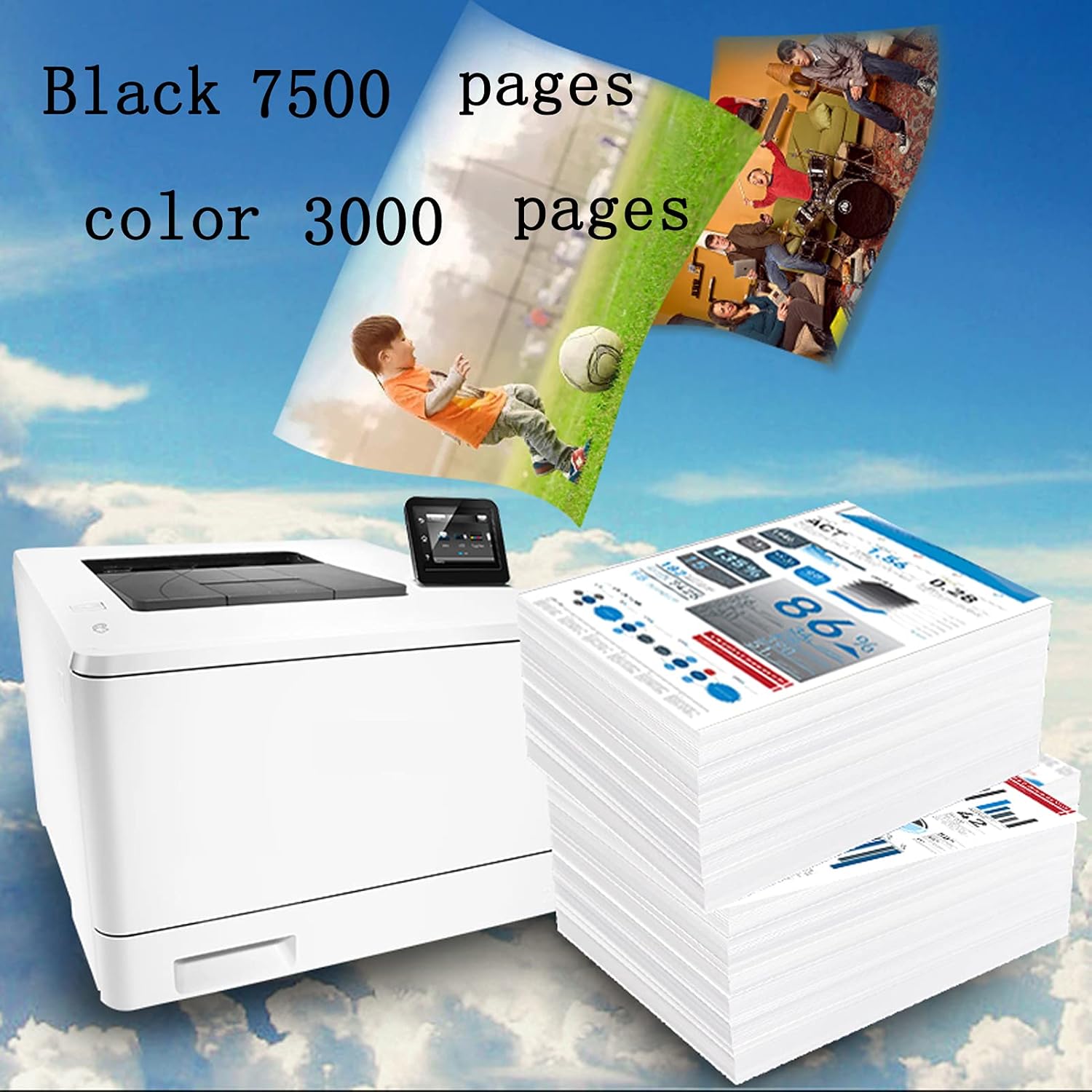 Pages Yield: 7500 pages (black toner) and 3000 pages (C/Y/M toner) at 5% coverage on (Letter/A4). Color: 1 black, 1 cyan, 1 magenta, 1 yellow. It is recommended that you buy them in combination. This will be more affordable