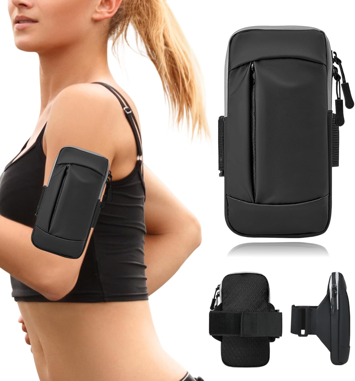 [Can it hold my phone and other essentials?] Yes! It fits phones up to 7.6 inches, compatible with iPhone 16/15/14/13/12/11 series, Samsung Galaxy Ultra/S, and more. The double-layer zippered pockets allow you to store keys, cash, earbuds, ID, and other essentials during your workout.