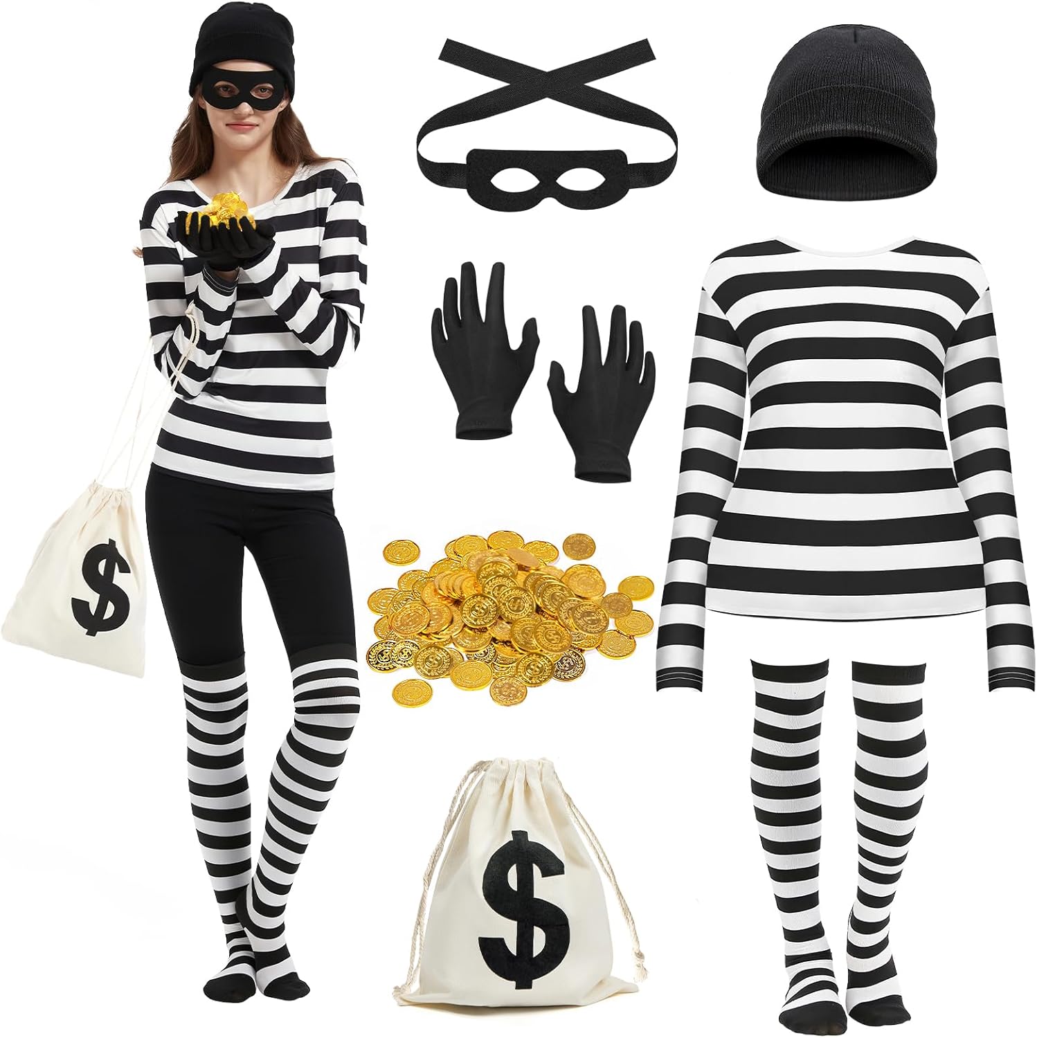 7 Pieces Halloween Women Robber Costume Set, Women Burglar Costume Thief Cosplay Striped Shirt Socks Mask Coins Gloves Beanie Bag for Halloween Party Outfit