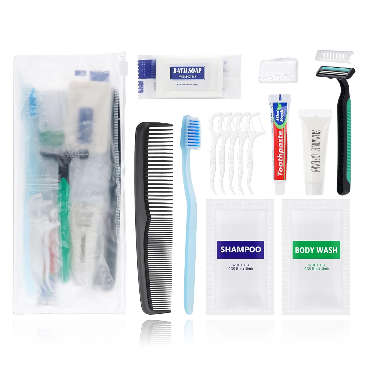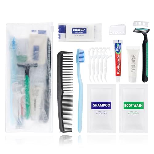 Comprehensive Travel Size Hygiene Kit:each kit has a toothbrush, toothbrush cap, mini toothpaste, comb, mini bar of soap,shampoo,body wash,shaver,shaving gel, some floss picks.Each kit is individual packaged in a sealing zipper bag