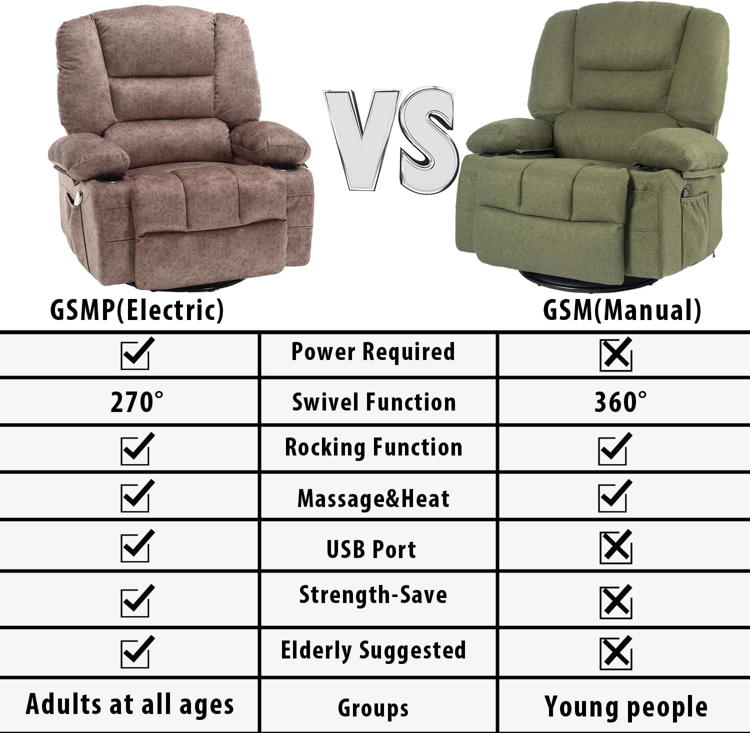 270° Power Swivel Rocker Recliner: Upgraded from the manual version of 9089GSM, the new electric version 9089GSMP remains all the original functions and adds an extra feature of USB charging. With the strength saving power mechanism, the electric recliner effectively avoids the trouble of closing the footrest and can be fixed at various positions within a generous 150-degree range. This rocking recliner is ideal for daily relaxation or as a baby nursery essential