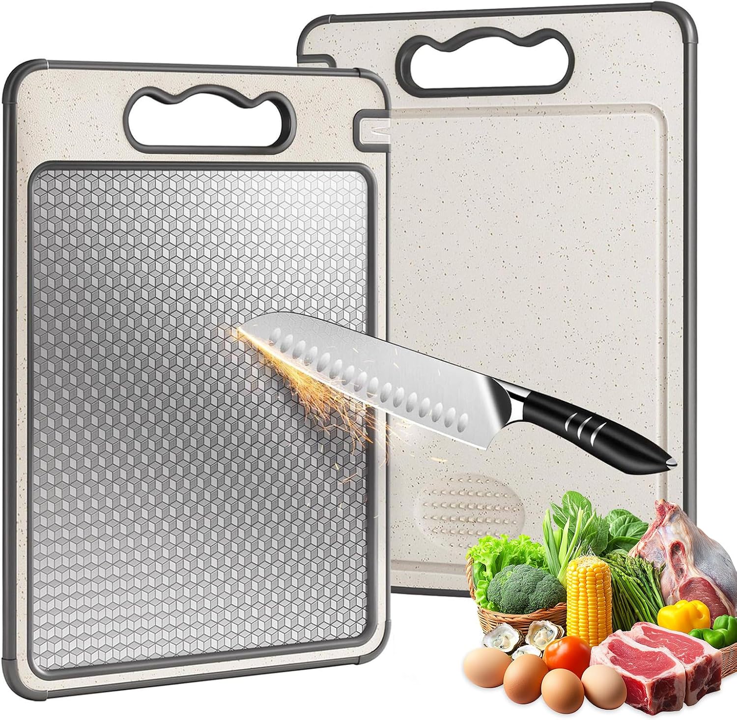 【2-in-1 for Safer Food Prep】The 304 Stainless Steel side is perfect for raw meats and poultry, while the Food-Grade Wheat Straw PP side is ideal for fruits, vegetables, and ready-to-eat foods. This cutting board's design effectively for healthier cooking