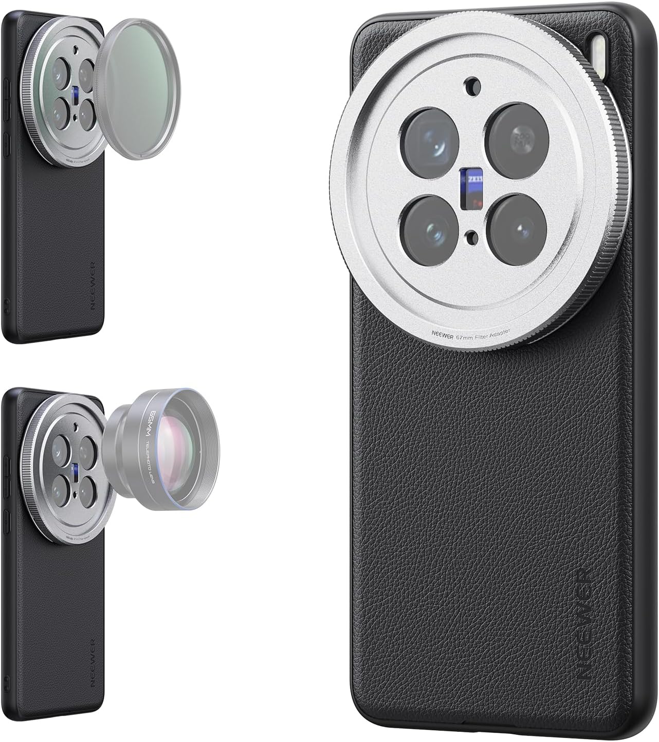 NEEWER X200 Pro Case, Protective Phone Case Compatible with VIVO X200 Pro, Heavy Duty TPU + PC Faux Leather with 17mm Lens Mounts & 67mm Filter Adapter for Wireless Charging, PA114 Black + Silver