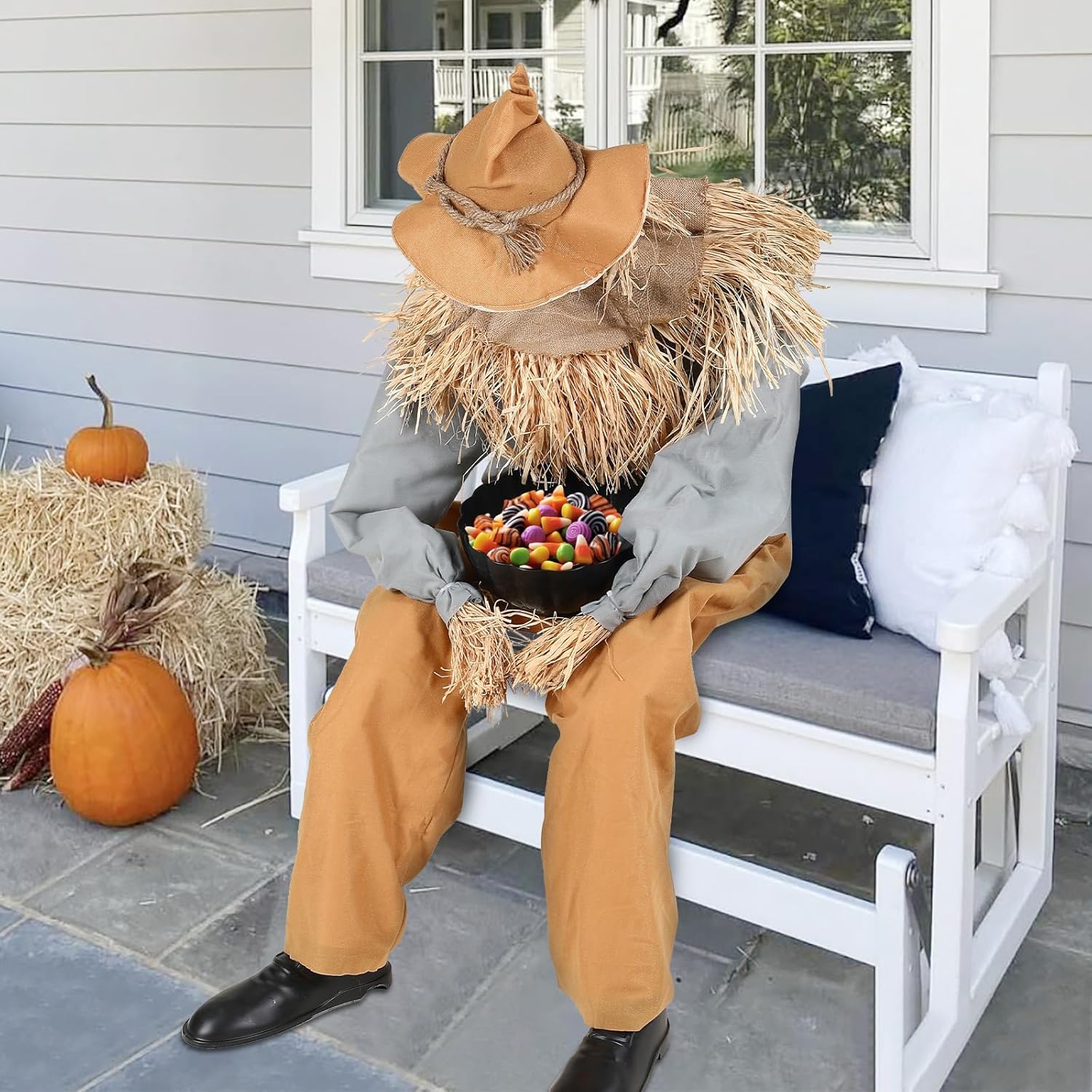 Unique Design--This sitting scarecrow features a detailed face, rustic outfit, and a large bowl for treats, making it both a spooky prop and a functional candy holder.