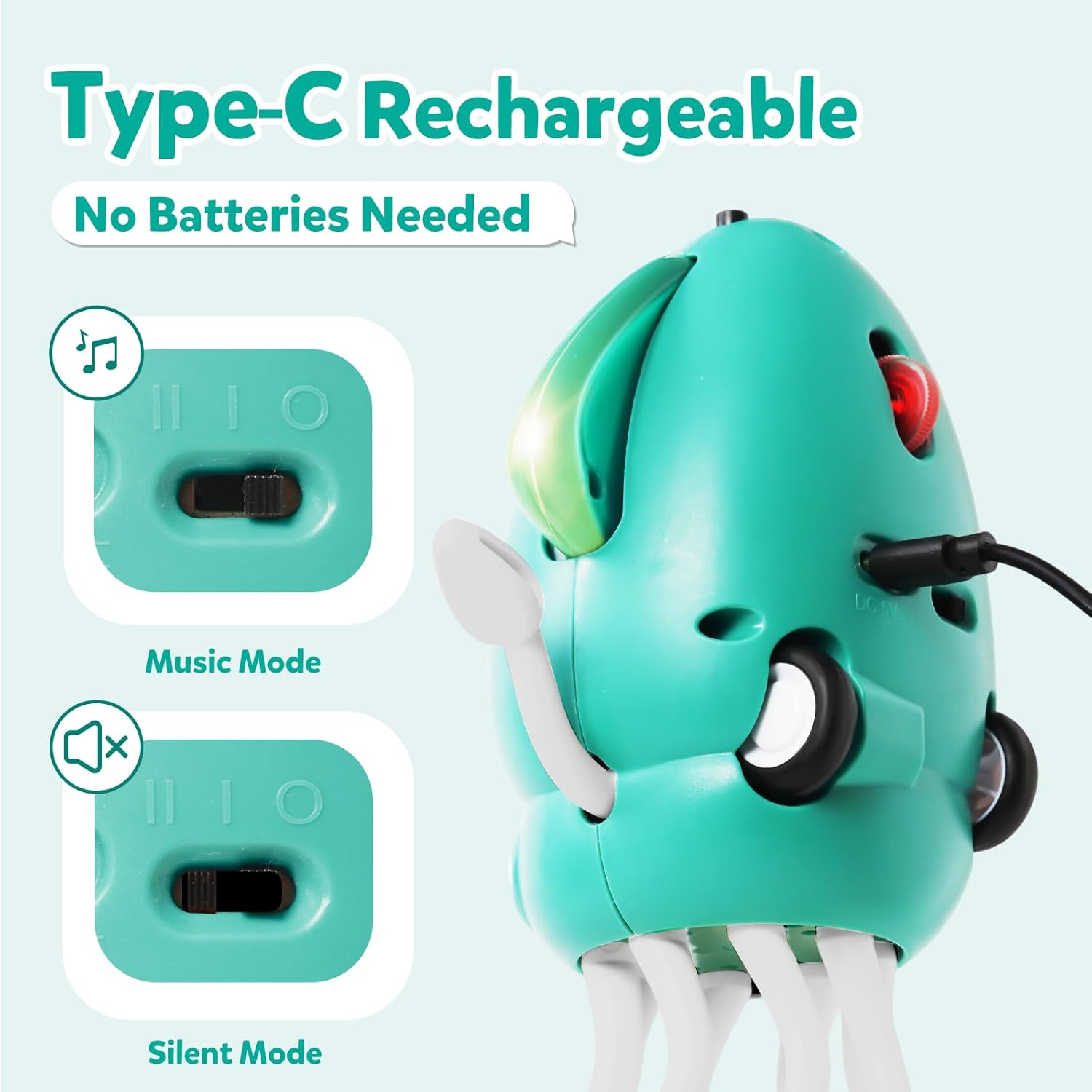 RECHARGEABLE & AUTO OBSTACLE: Includes a quiet mode (music off) and is Type-C rechargeable. This electric crawling octopus toy has a built-in intelligent sensor to detect and bypass obstacles, helping it stay safe and keep the fun going. It automatically turns and changes direction to attract children's attention and encourage them to crawl along