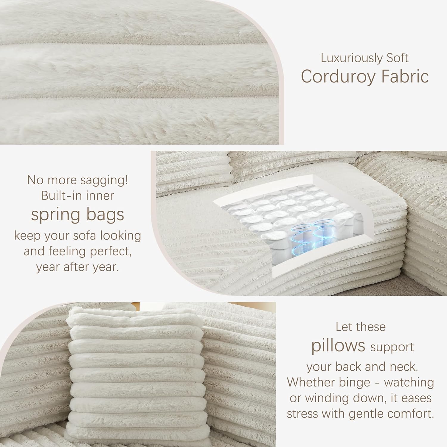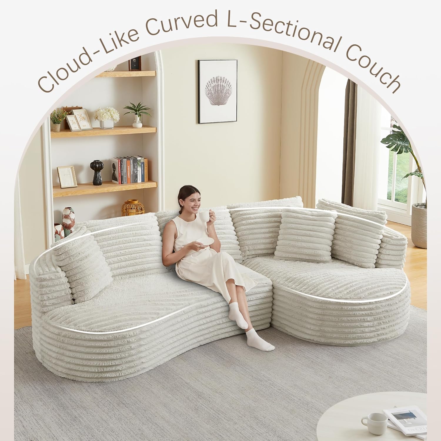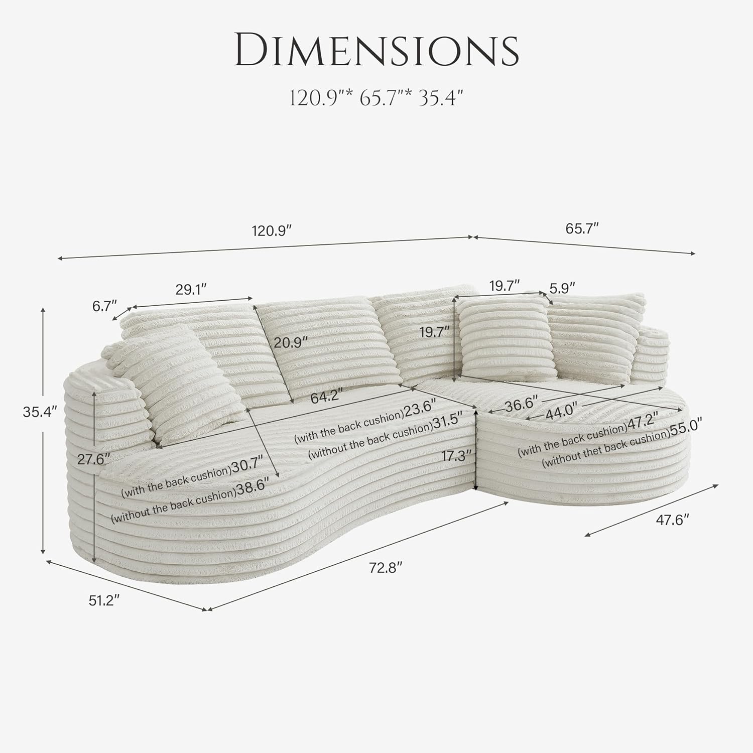 120.9" Curved L-Shape Sectional Sofa with Right Chaise, Cloud-Like Corduroy Couch with Pocket Springs, No Assembly Required Compressed in Box for Living Room & Apartment, Cream