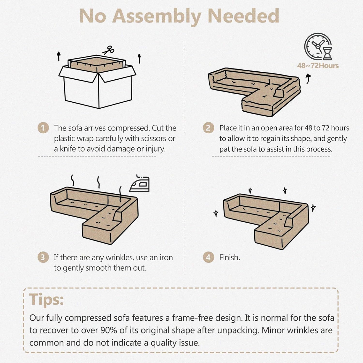 "Unbox Instant Luxury, No Tools Needed": Arrives vacuum-compressed; simply unseal and let it expand naturally within 72 hours. Gently pat cushions to accelerate fluffiness—ready for immediate lounging.