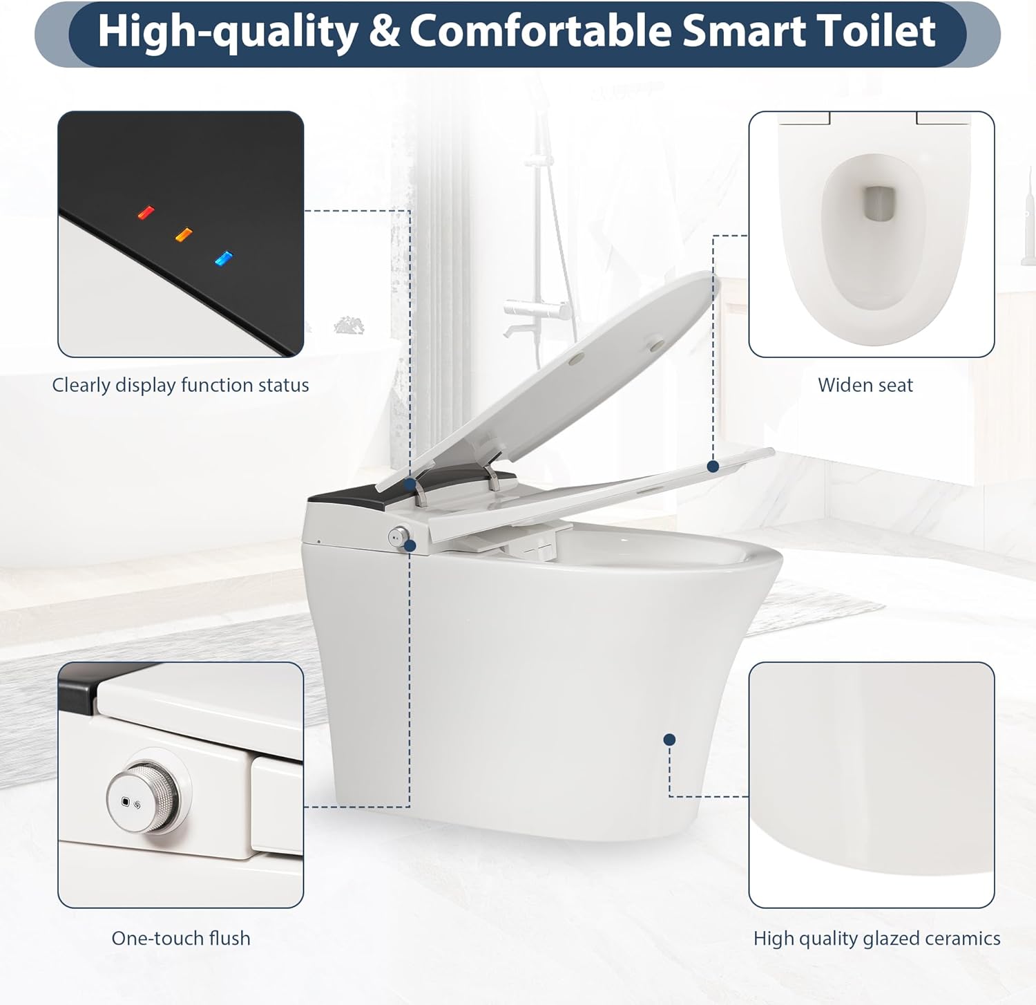 Soft Night Light: The smart toilet including night light, Knob ambient light,providing convenient visibility during nighttime bathroom visits. Prevent midnight accidents and make your trips to toilet safer for your family