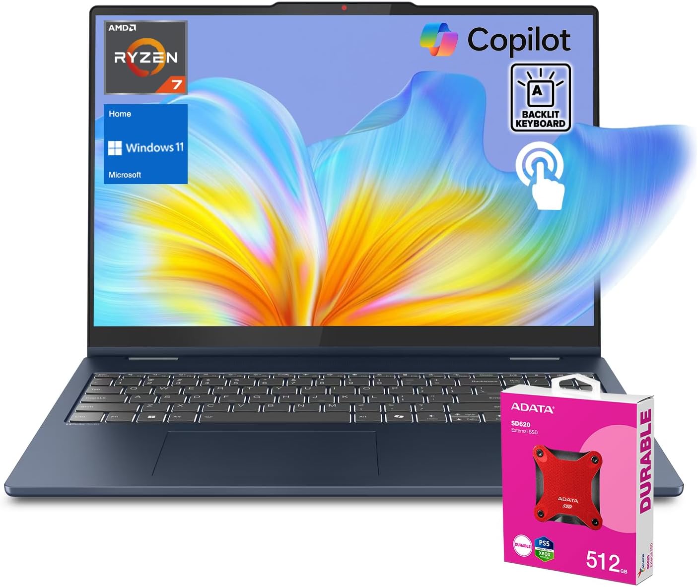 Lenovo 2025 IdeaPad Slim 5 Next Gen AI Copilot Business Laptop, 16" FHD+ Touchscreen, AMD Ryzen 7 350, 64GB DDR5 RAM, 2TB SSD, Backlit KB, Wi-Fi 7, W11H, Bundle with ADATA 512GB External SSD