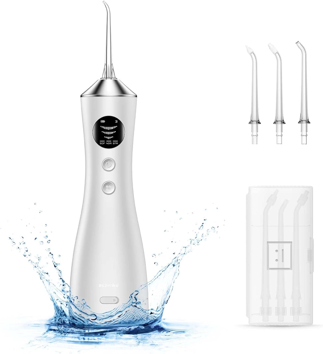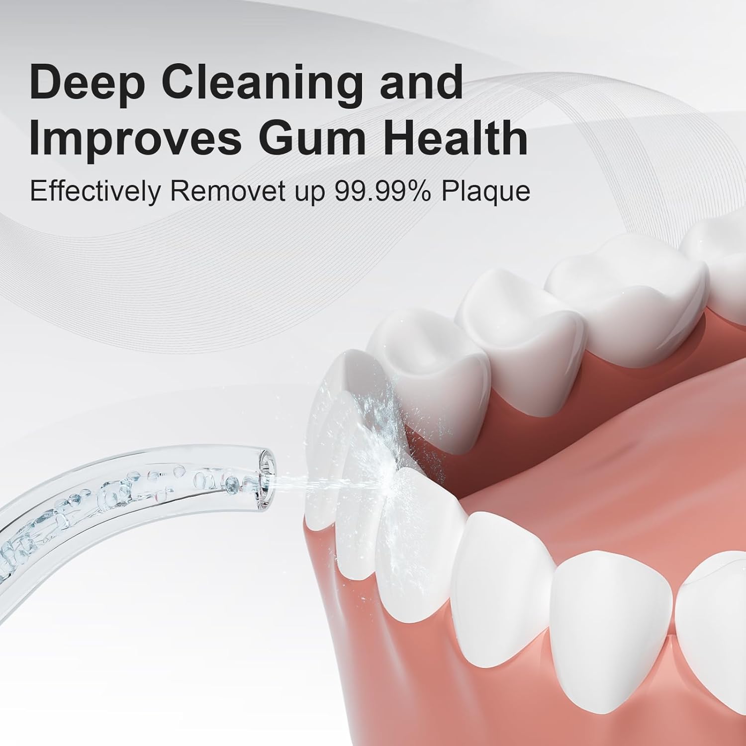 【Efficient Cleaning Technology】BUZHIWU water flosser can effectively clean the gaps between teeth, remove small food residues, reduce gum bleeding, and improve gum swelling and pain. In addition, it can also be used for cleaning braces and dental implants. It can remove 99% of tooth stains and solve oral problems such as bad breath.