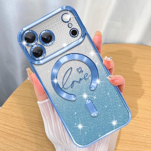 ZIYE Magnetic Case Designed for iPhone 17 Pro Max Glitter Case Luxury Plating Love Heart Compatible with MagSafe Clear Case with Camera Protection Shockproof Cover Made for Women Girls-Blue